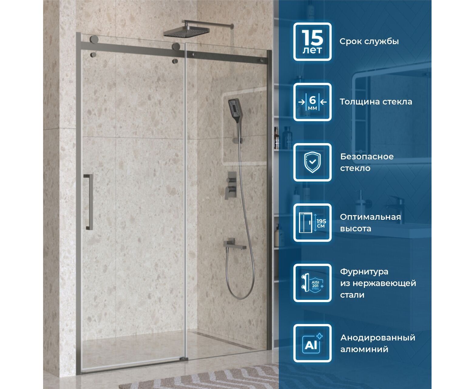 Коллекция предлагает четыре модели душевых ограждений на выбор: квадратные (A-2), прямоугольные (AH-1, AH-2) и дверь в нишу (BF-1). Все модели имеют оптимальную высоту 1950 мм. и представлены в популярных размерах, что позволяет найти идеальное решение для обеспечения комфорта и практичности душевой зоны.