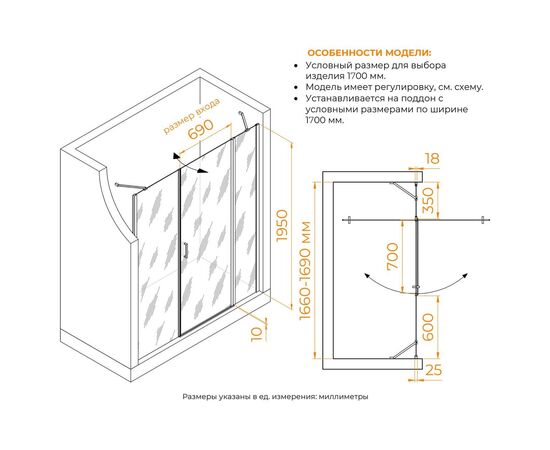 Характеристики Душевая дверь RGW LE-009 (LE-004 + Z-09+профиль A-14)