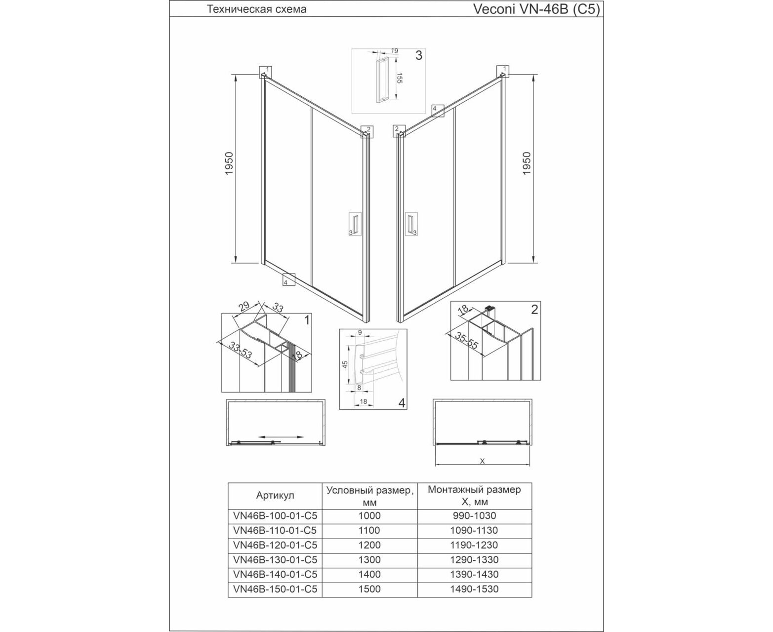 Характеристики Душевая дверь Veconi Vianno VN-46B 1100x1950 черный матовый стекло прозрачное