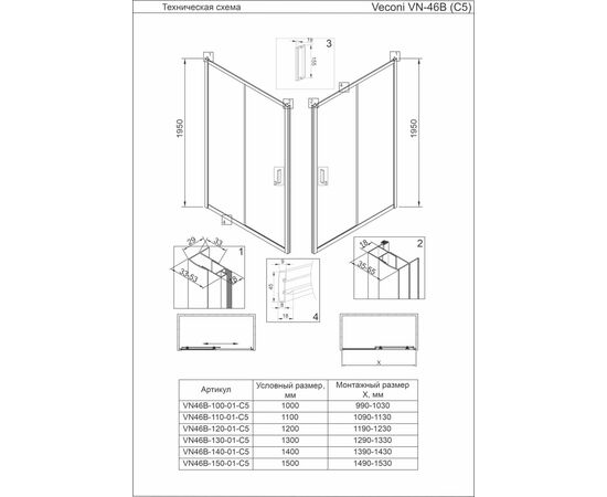 Характеристики Душевая дверь Veconi Vianno VN-46B 1450x1950 черный матовый стекло прозрачное