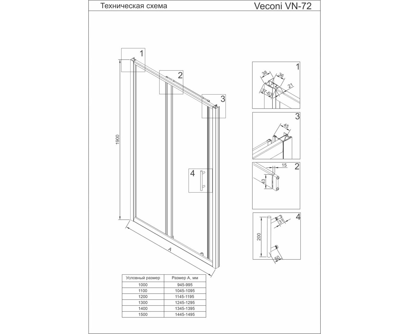 Характеристики Душевая дверь Veconi Vianno VN-72 1100x1900 хром стекло прозрачное