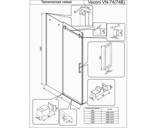 Характеристики Душевая дверь Veconi Vianno VN-74B 1400x1950 черный стекло прозрачное