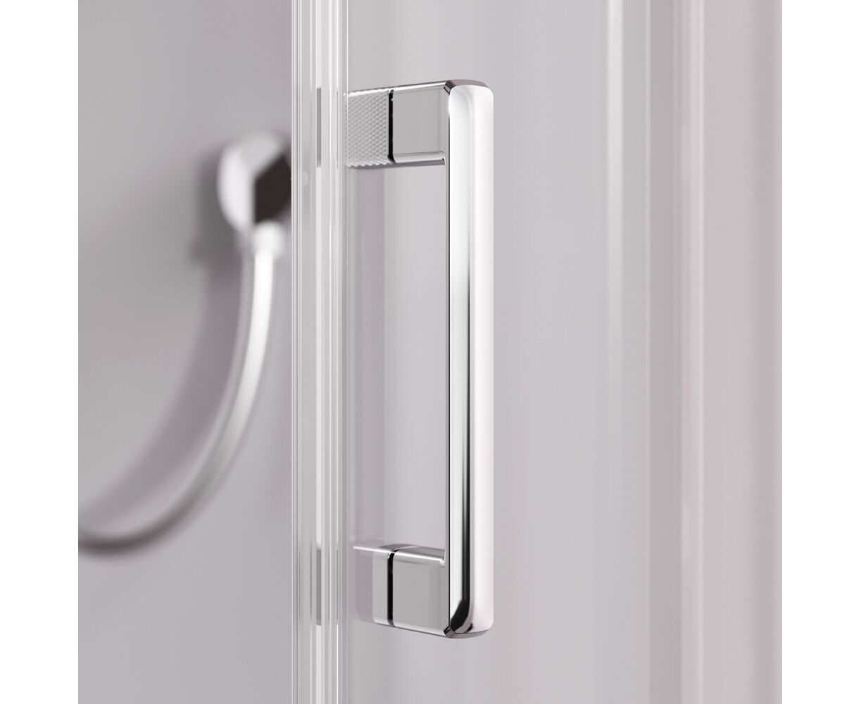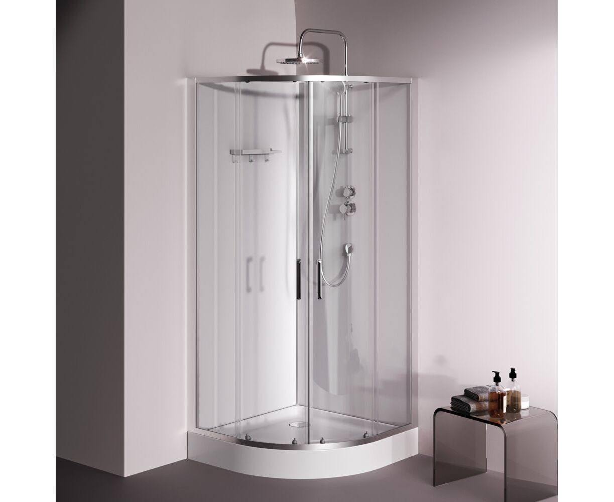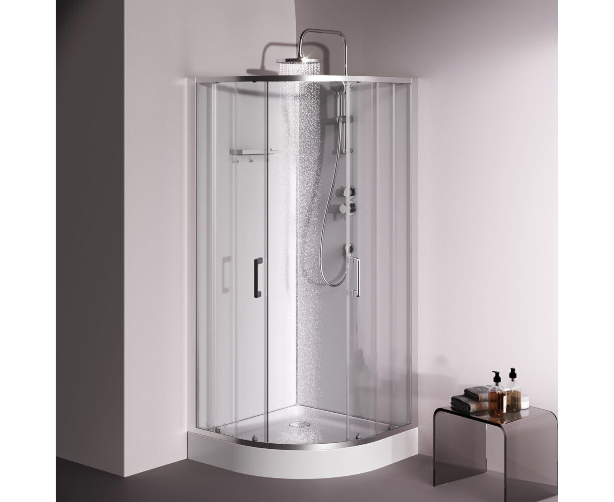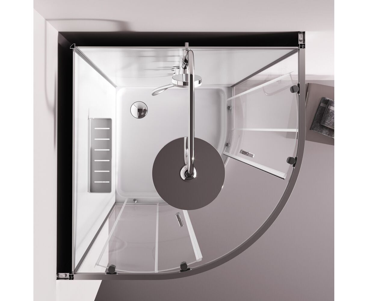 Душевая кабина без крыши, с тропическим верхним душем. Держателем ручного душа регулируемого по высоте, удобная съёмная полка с крючками, отсутствует угловая колонна, что увеличивает внутренне пространство внутри кабины, стильные ручки с паттерном. Ультратонкие профили, создающие невесомость конструкции кабины.
