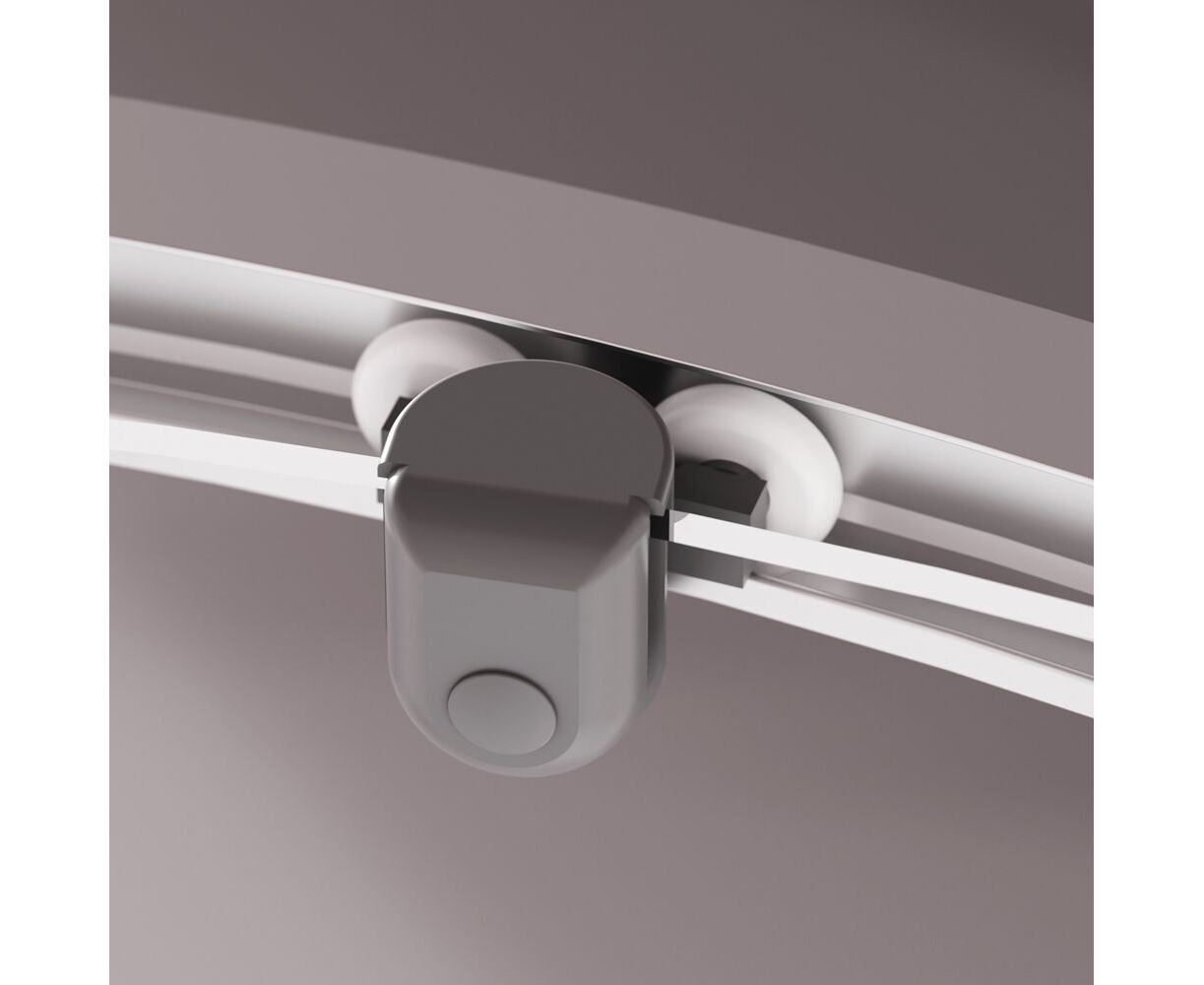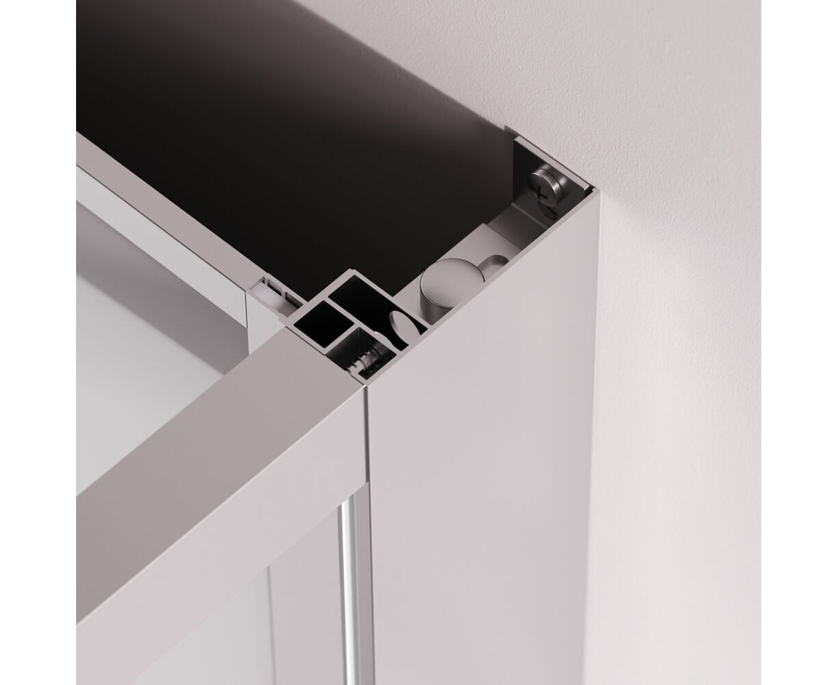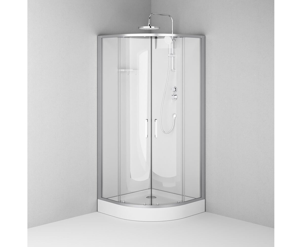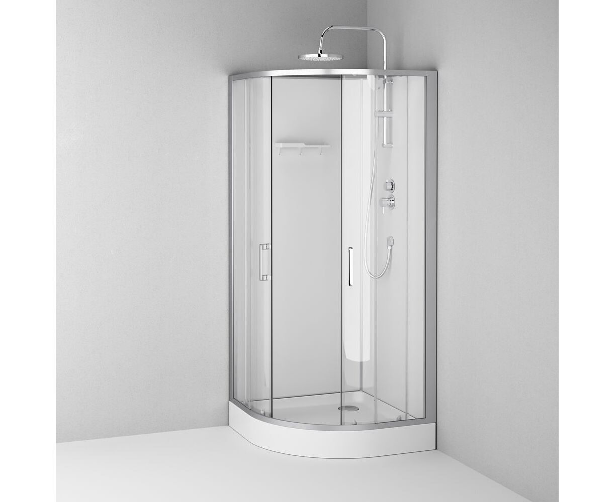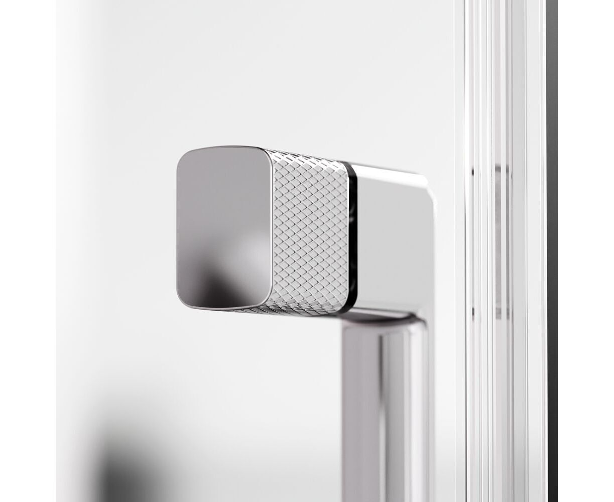 Душевая кабина без крыши, с тропическим верхним душем. Держателем ручного душа регулируемого по высоте, удобная съёмная полка с крючками, отсутствует угловая колонна, что увеличивает внутренне пространство внутри кабины, стильные ручки с паттерном. Ультратонкие профили, создающие невесомость конструкции кабины.