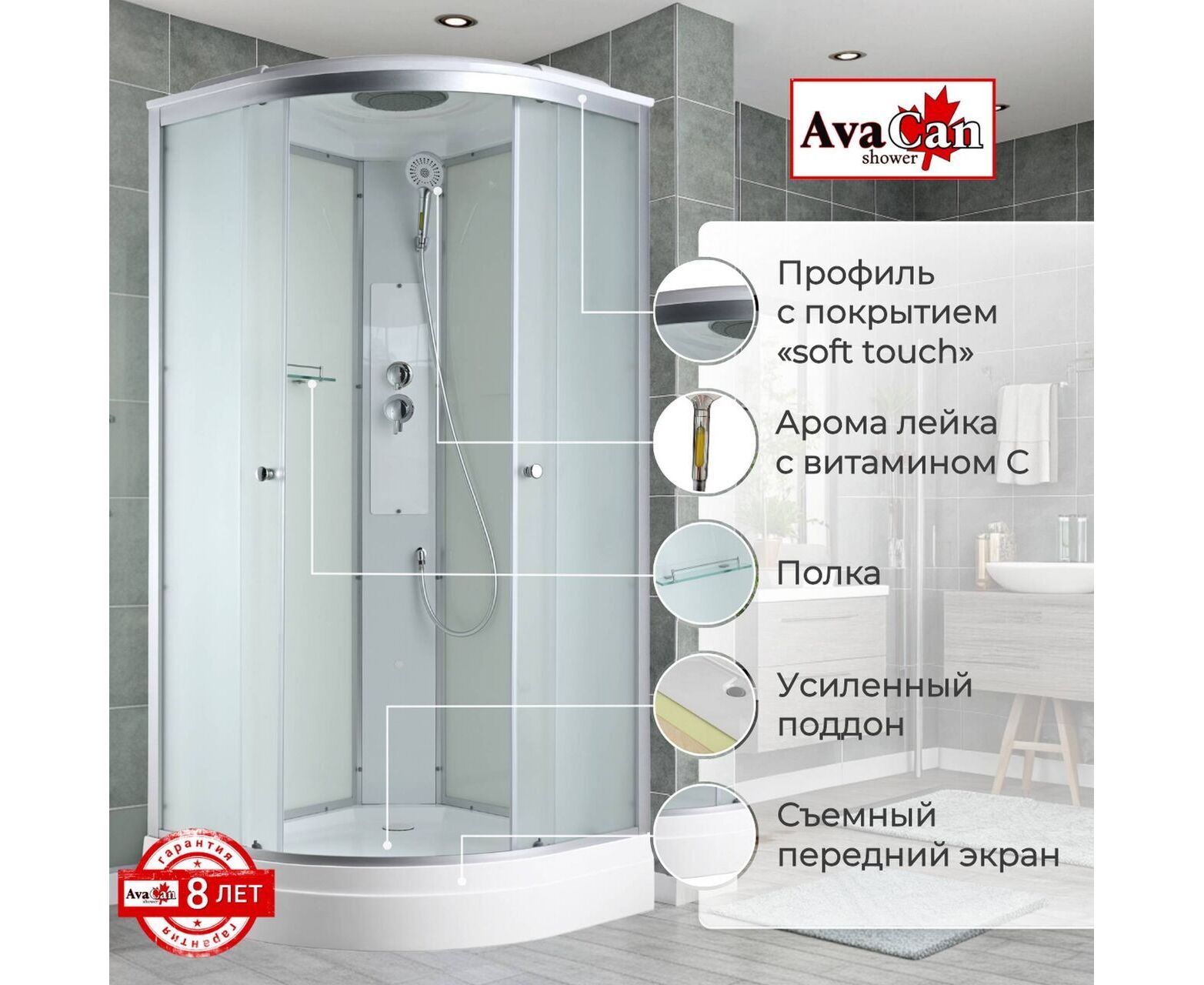 Стильная душевая кабина AvaCan C2010 сочетает в себе высокую функциональность, практичность и надежность. При изготовлении применяется безопасное закаленное стекло толщиной 4 мм (матовое), надежно фиксируемое алюминиевым профилем. Сборка без силикона (увеличивает срок службы), внутренняя сборка (облегчает установку и ревизию, позволяет установить душевую кабину в ограниченном пространстве),смеситель резьбовой (без хомутов), съемный экран поддона (позволяет осуществлять ревизию сифона), цвет профиля матовый хром. Двойные металлические ролики дверей (увеличивают срок службы).В комплекте : полочка, тропический (верхний) душ, арома-лейка с витамином С (картридж съемный).