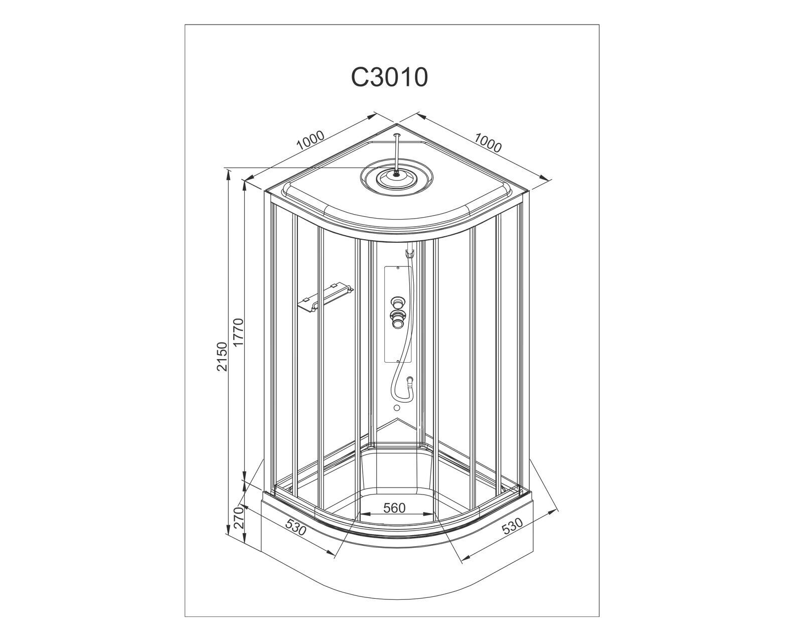 Стильная душевая кабина AvaCan C 3010 сочетает в себе высокую функциональность, практичность и надежность. При изготовлении применяется безопасное закаленное стекло толщиной 4 мм (матовое), надежно фиксируемое алюминиевым профилем. Сборка без силикона (увеличивает срок службы), внутренняя сборка (облегчает установку и ревизию, позволяет установить душевую кабину в ограниченном пространстве),смеситель резьбовой (без хомутов), съемный экран поддона (позволяет осуществлять ревизию сифона), цвет профиля матовый хром. Двойные металлические ролики дверей (увеличивают срок службы).В комплекте : полочка, тропический (верхний) душ, арома-лейка с витамином С (картридж съемный).
