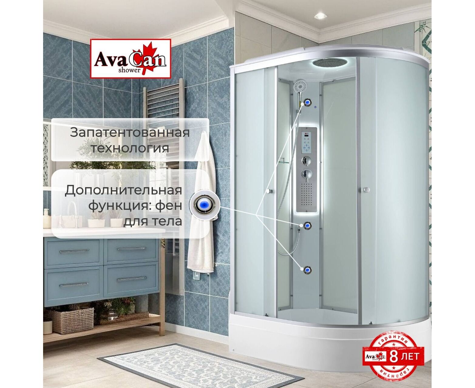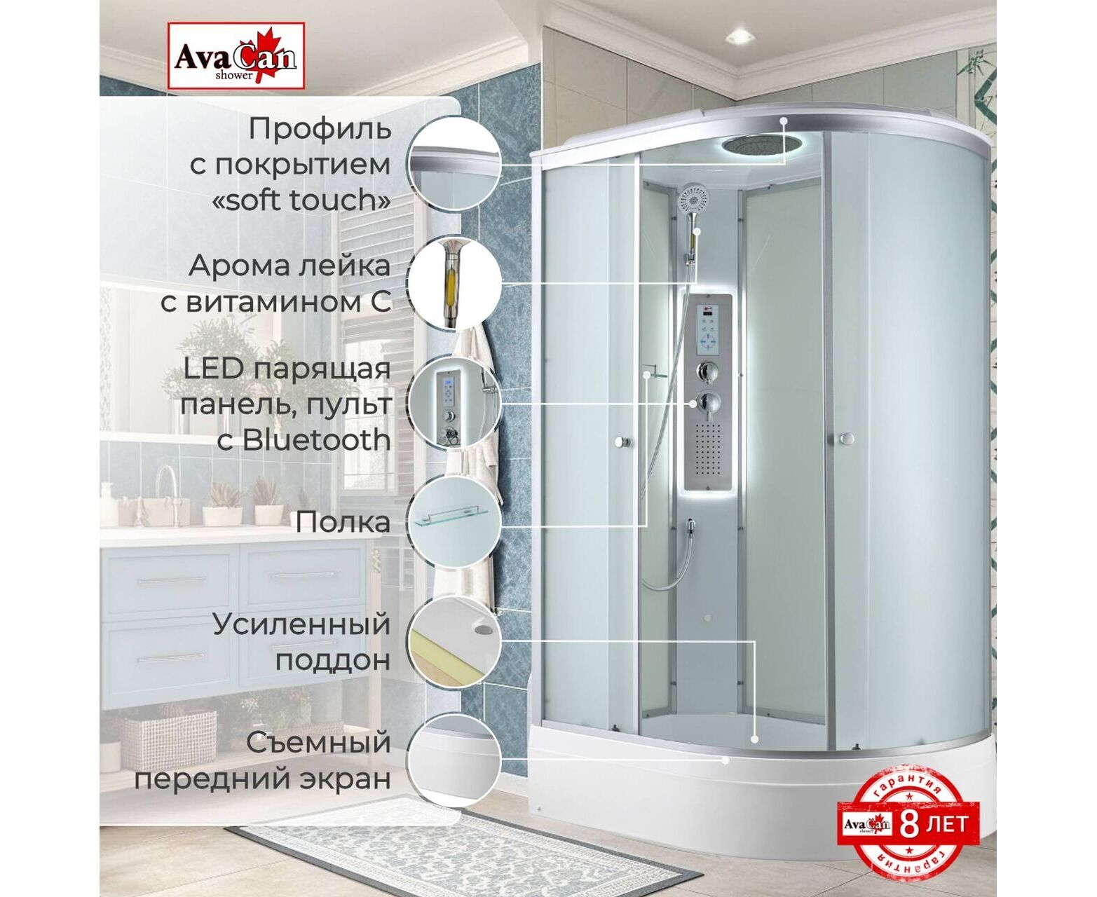 Стильная душевая кабина AvaCan C 3012L LED сочетает в себе высокую функциональность, практичность и надежность. При изготовлении применяется безопасное закаленное стекло толщиной 4 мм (матовое), надежно фиксируемое алюминиевым профилем. Сборка без силикона (увеличивает срок службы), внутренняя сборка(облегчает установку и ревизию; позволяет установить в ограниченном пространстве), смеситель резьбовой (без хомутов). Съемный экран поддона (позволяет осуществлять ревизию сифона). Цвет профиля матовый хром. Двойные металлические ролики дверей (увеличивают срок службы).В комплекте : полочка, тропический (верхний) душ, арома-лейка с витамином С (картридж съемный), сенсорный пульт (блютуз, радио, LED подсветка в крыше и в центральной панели, вентелятор.)