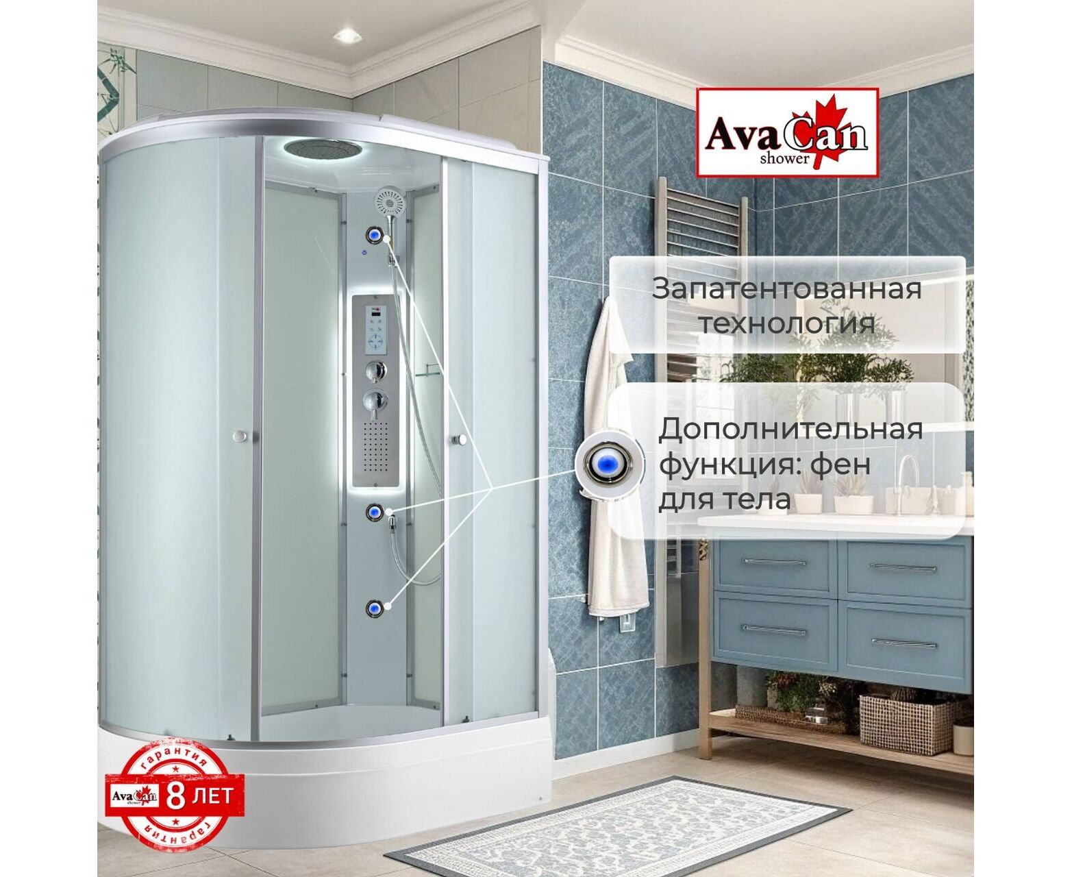 Стильная душевая кабина AvaCan C 3012R LED сочетает в себе высокую функциональность, практичность и надежность. При изготовлении применяется безопасное закаленное стекло толщиной 4 мм (матовое), надежно фиксируемое алюминиевым профилем. Сборка без силикона (увеличивает срок службы), внутренняя сборка(облегчает установку и ревизию; позволяет установить в ограниченном пространстве), смеситель резьбовой (без хомутов). Съемный экран поддона (позволяет осуществлять ревизию сифона). Цвет профиля матовый хром. Двойные металлические ролики дверей (увеличивают срок службы).В комплекте : полочка, тропический (верхний) душ, арома-лейка с витамином С (картридж съемный), сенсорный пульт (блютуз, радио, LED подсветка в крыше и в центральной панели, вентелятор.)