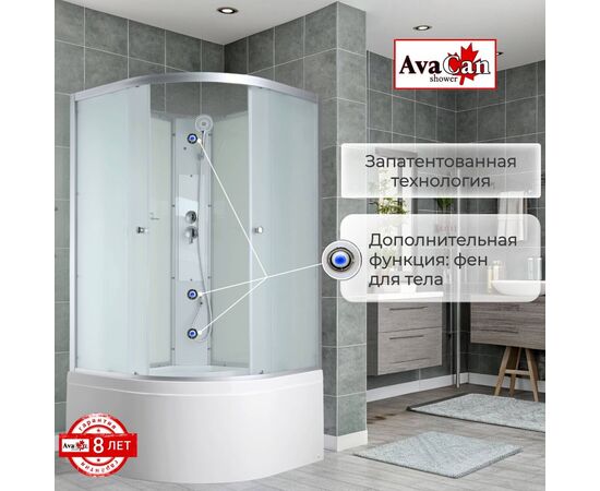 Стильная душевая кабина AvaCan C5010 N сочетает в себе высокую функциональность, практичность и надежность. При изготовлении применяется безопасное закаленное стекло толщиной 4 мм (матовое), надежно фиксируемое алюминиевым профилем. Сборка без силикона (увеличивает срок службы), внутренняя сборка (облегчает установку ,ревизию, позволяет установить душевую кабину в ограниченном пространстве, в том числе в нишу),смеситель резьбовой (без хомутов). Съемный экран поддона (позволяет осуществлять ревизию сифона). Цвет профиля матовый хром. Двойные металлические ролики дверей (увеличивают срок службы). В комплекте: полочка, арома-лейка с витамином С (картридж съемный).