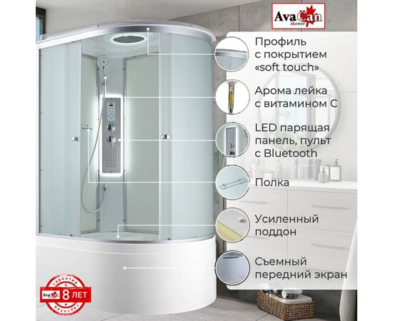 Стильная душевая кабина AvaCan C5012L LED сочетает в себе высокую функциональность, практичность и надежность. При изготовлении применяется безопасное закаленное стекло толщиной 4 мм (матовое), надежно фиксируемое алюминиевым профилем. Сборка без силикона (увеличивает срок службы), внутренняя сборка(облегчает установку и ревизию; позволяет установить в ограниченном пространстве), смеситель резьбовой (без хомутов). Съемный экран поддона (позволяет осуществлять ревизию сифона). Цвет профиля матовый хром. Двойные металлические ролики дверей (увеличивают срок службы).В комплекте : полочка, тропический (верхний) душ, арома-лейка с витамином С (картридж съемный), сенсорный пульт (блютуз, радио, LED подсветка в крыше и в центральной панели, вентелятор.)