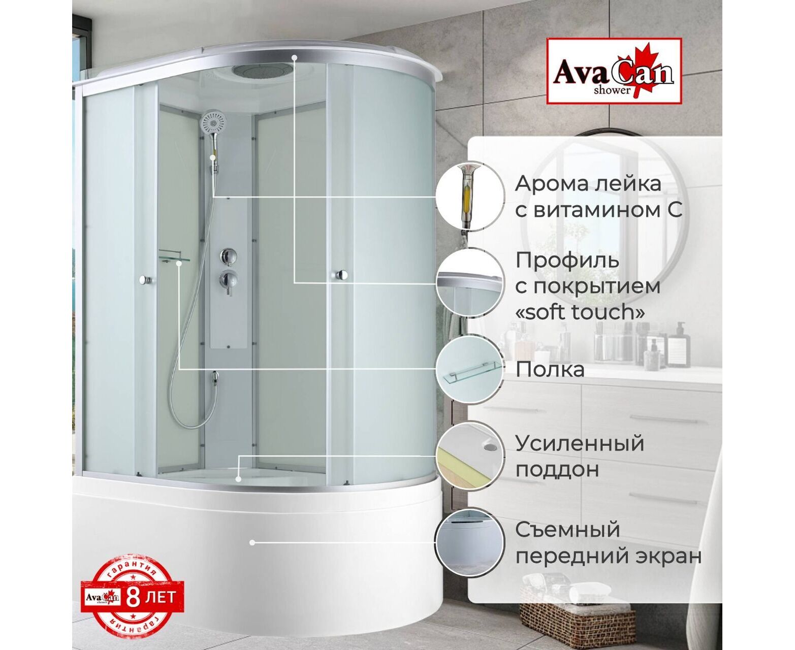 Стильная душевая кабина AvaCan C 5012L сочетает в себе высокую функциональность, практичность и надежность. При изготовлении применяется безопасное закаленное стекло толщиной 4 мм (матовое), надежно фиксируемое алюминиевым профилем. Сборка без силикона (увеличивает срок службы), внутренняя сборка (облегчает установку и ревизию, позволяет установить душевую кабину в ограниченном пространстве),смеситель резьбовой (без хомутов), съемный экран поддона (позволяет осуществлять ревизию сифона), цвет профиля матовый хром. Двойные металлические ролики дверей (увеличивают срок службы).В комплекте : полочка, тропический (верхний) душ, арома-лейка с витамином С (картридж съемный).