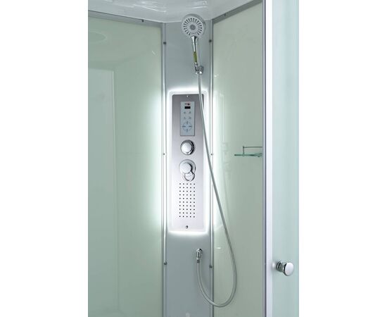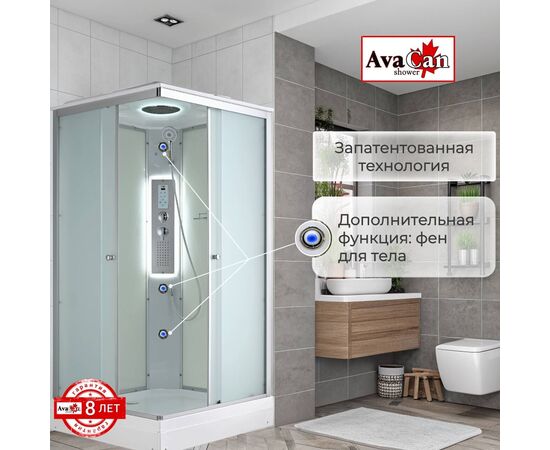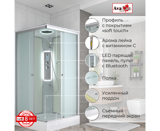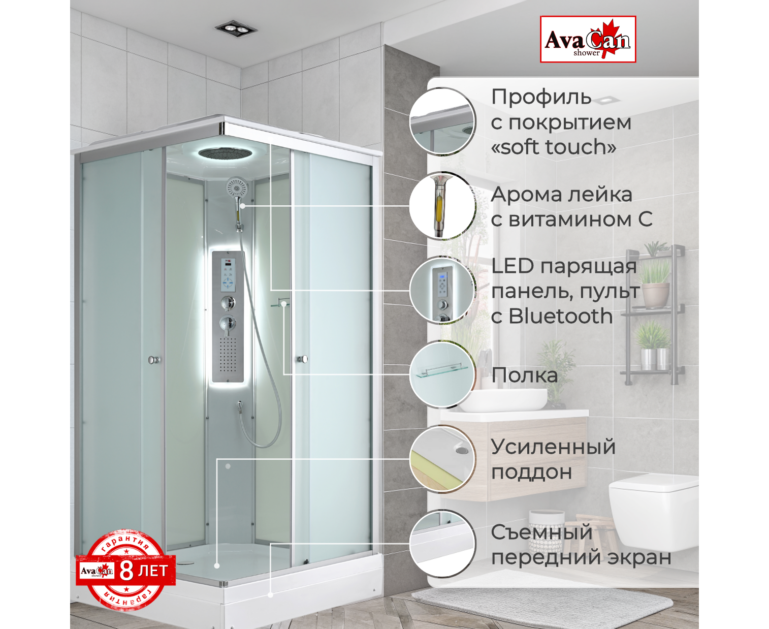 Стильная душевая кабина AvaCan сочетает в себе высокую функциональность, практичность и надежность. При изготовлении применяется безопасное закаленное стекло, надежно фиксируемое алюминиевым профилем.Профиль сделан из алюминия повышенной прочности. Сборка без силикона (увеличивает срок службы, защищает от протечек), внутренняя сборка (облегчает установку и ревизию; позволяет установить в ограниченном пространстве и обойтись без демонтажа других сантехнических приборов), смеситель резьбовой (без хомутов). Съемный экран поддона (позволяет осуществлять подключение и ревизию сифона).Двойные металлические ролики дверей (распределение нагрузки на два ролика, увеличивают срок службы).Ручная арома-лейка с витамином С (картридж в комплекте,есть возможность замены или удаления картриджа), полочка(из стекла, с ограничителем), сифон с гидрозатвором, сенсорный пульт управления с функциями: блютуз, LED подсветка, радио, вытяжка, гидромассаж спины, тропический (верхний) душ.