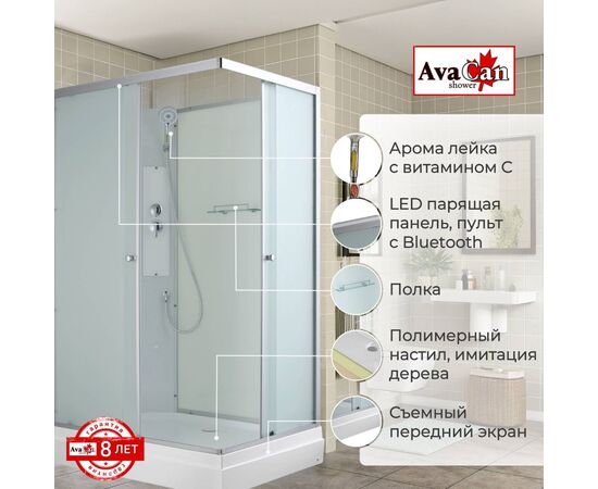 Стильная душевая кабина AvaCan сочетает в себе высокую функциональность, практичность и надежность. При изготовлении применяется безопасное закаленное стекло, надежно фиксируемое алюминиевым профилем. Профиль сделан из алюминия повышенной прочности. Сборка без силикона (увеличивает срок службы, защищает от протечек), внутренняя сборка (облегчает установку и ревизию; позволяет установить в ограниченном пространстве и обойтись без демонтажа других сантехнических приборов), смеситель резьбовой (без хомутов). Съемный экран поддона (позволяет осуществлять подключение и ревизию сифона). Двойные металлические ролики дверей (распределение нагрузки на два ролика, увеличивают срок службы). Ручная арома-лейка с витамином С (картридж в комплекте, есть возможность замены или удаления картриджа), полочка (из стекла, с ограничителем), сифон с гидрозатвором.