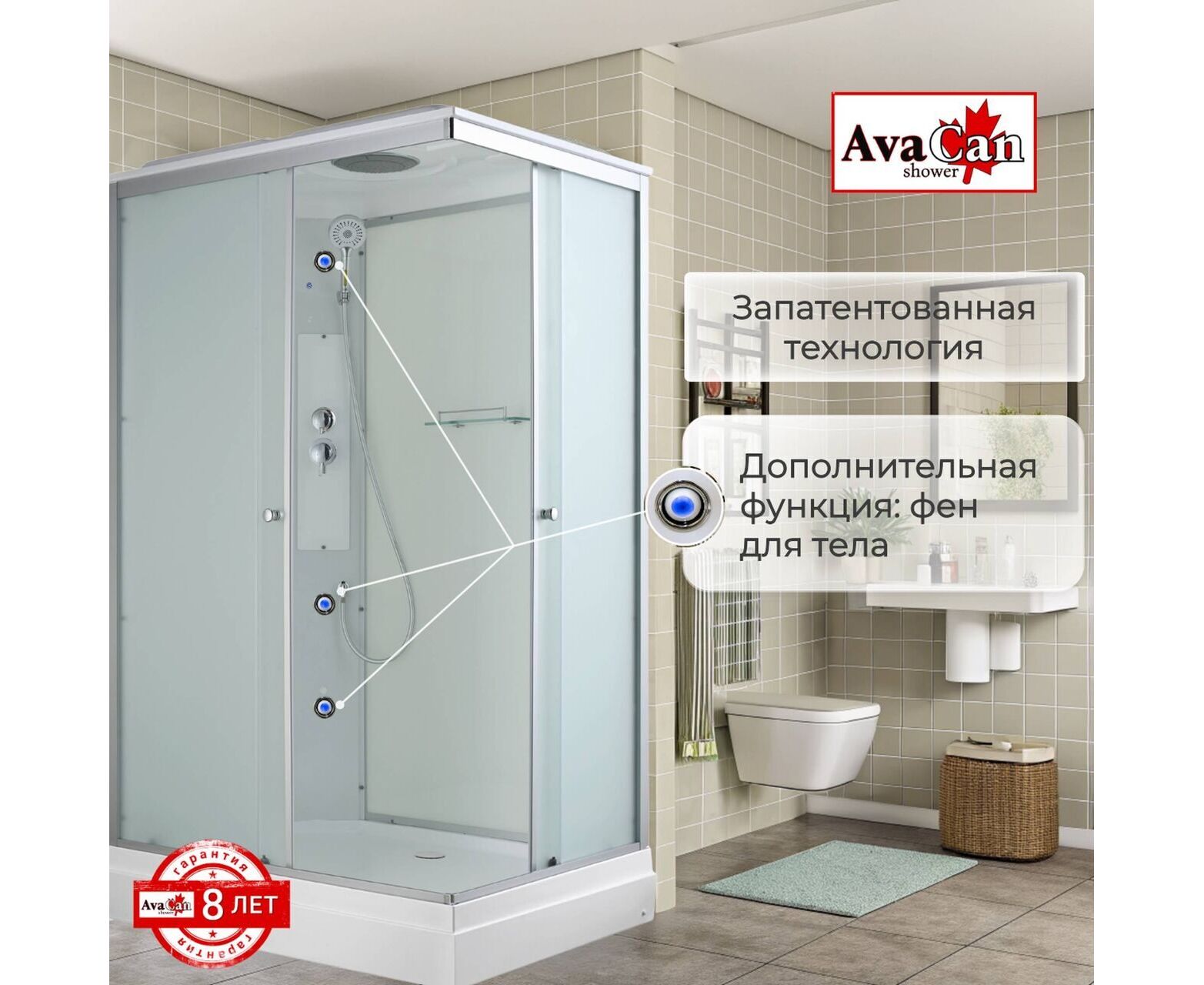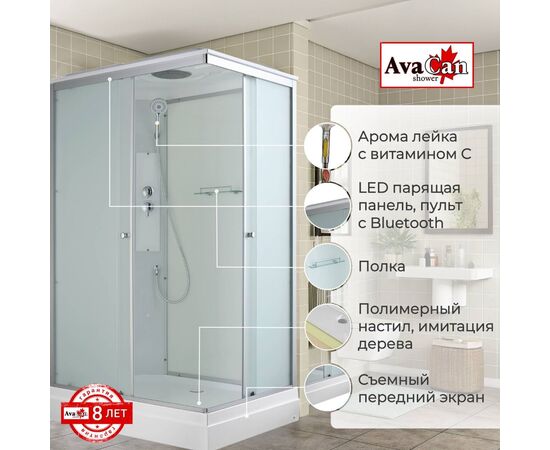 Стильная душевая кабина AvaCan сочетает в себе высокую функциональность, практичность и надежность. При изготовлении применяется безопасное закаленное стекло, надежно фиксируемое алюминиевым профилем. Профиль сделан из алюминия повышенной прочности. Сборка без силикона (увеличивает срок службы, защищает от протечек), внутренняя сборка (облегчает установку и ревизию; позволяет установить в ограниченном пространстве и обойтись без демонтажа других сантехнических приборов), смеситель резьбовой (без хомутов). Съемный экран поддона (позволяет осуществлять подключение и ревизию сифона). Двойные металлические ролики дверей (распределение нагрузки на два ролика, увеличивают срок службы). Ручная арома-лейка с витамином С (картридж в комплекте, есть возможность замены или удаления картриджа), полочка (из стекла, с ограничителем), сифон с гидрозатвором.