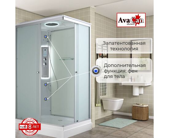 Стильная душевая кабина AvaCan сочетает в себе высокую функциональность, практичность и надежность. При изготовлении применяется безопасное закаленное стекло, надежно фиксируемое алюминиевым профилем.Профиль сделан из алюминия повышенной прочности. Сборка без силикона (увеличивает срок службы, защищает от протечек), внутренняя сборка (облегчает установку и ревизию; позволяет установить в ограниченном пространстве и обойтись без демонтажа других сантехнических приборов), смеситель резьбовой (без хомутов). Съемный экран поддона (позволяет осуществлять подключение и ревизию сифона).Двойные металлические ролики дверей (распределение нагрузки на два ролика, увеличивают срок службы).Ручная арома-лейка с витамином С (картридж в комплекте,есть возможность замены или удаления картриджа), полочка(из стекла, с ограничителем), сифон с гидрозатвором, сенсорный пульт управления с функциями: блютуз, LED подсветка, радио, вытяжка, гидромассаж спины, тропический (верхний) душ.