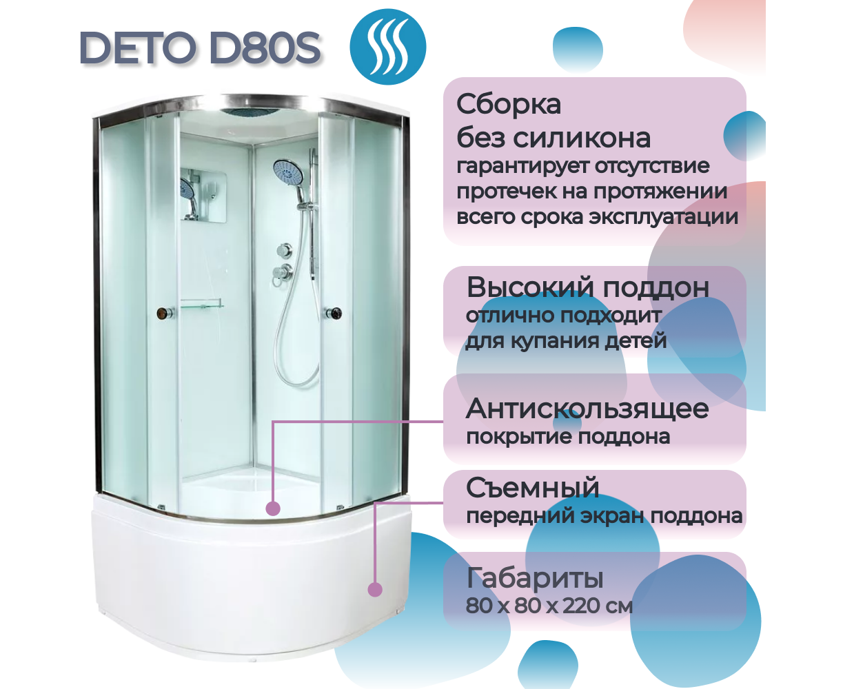 Душевая кабина DTO D80S - надежное оборудование для ванной комнаты. Имеет современный дизайн и весь набор самых необходимых функций для комфортного приема душа.