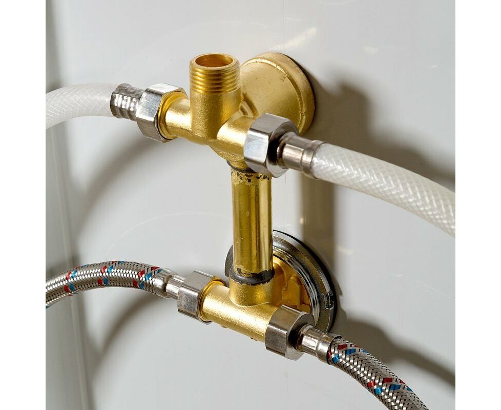 Латунный смеситель с керамическими картриджами и резьбовыми соединениями.