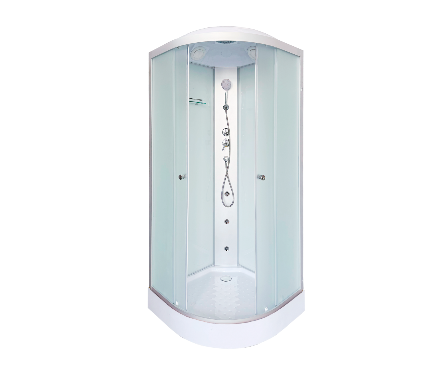 Ориентация: универсальная. Управление: ручное. Гидромассаж в кабине: есть. Исполнение полотна двери: матовое. Цвет задней стенки: белый. Материал полотна двери: стекло. Вход: спереди. Антискользящее покрытие поддона: есть. Исполнение задней стенки: матовое стекло. Освещение: нет.