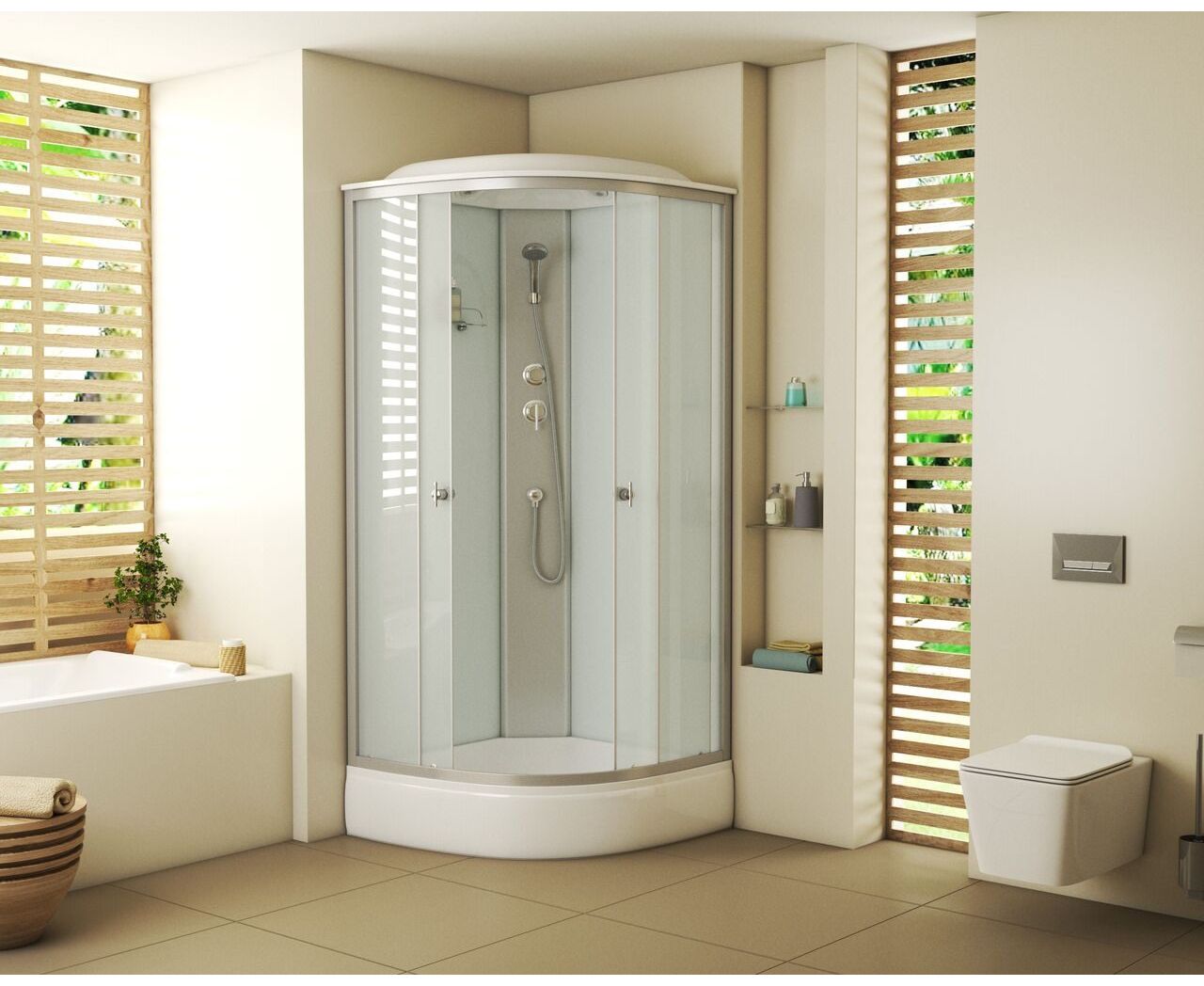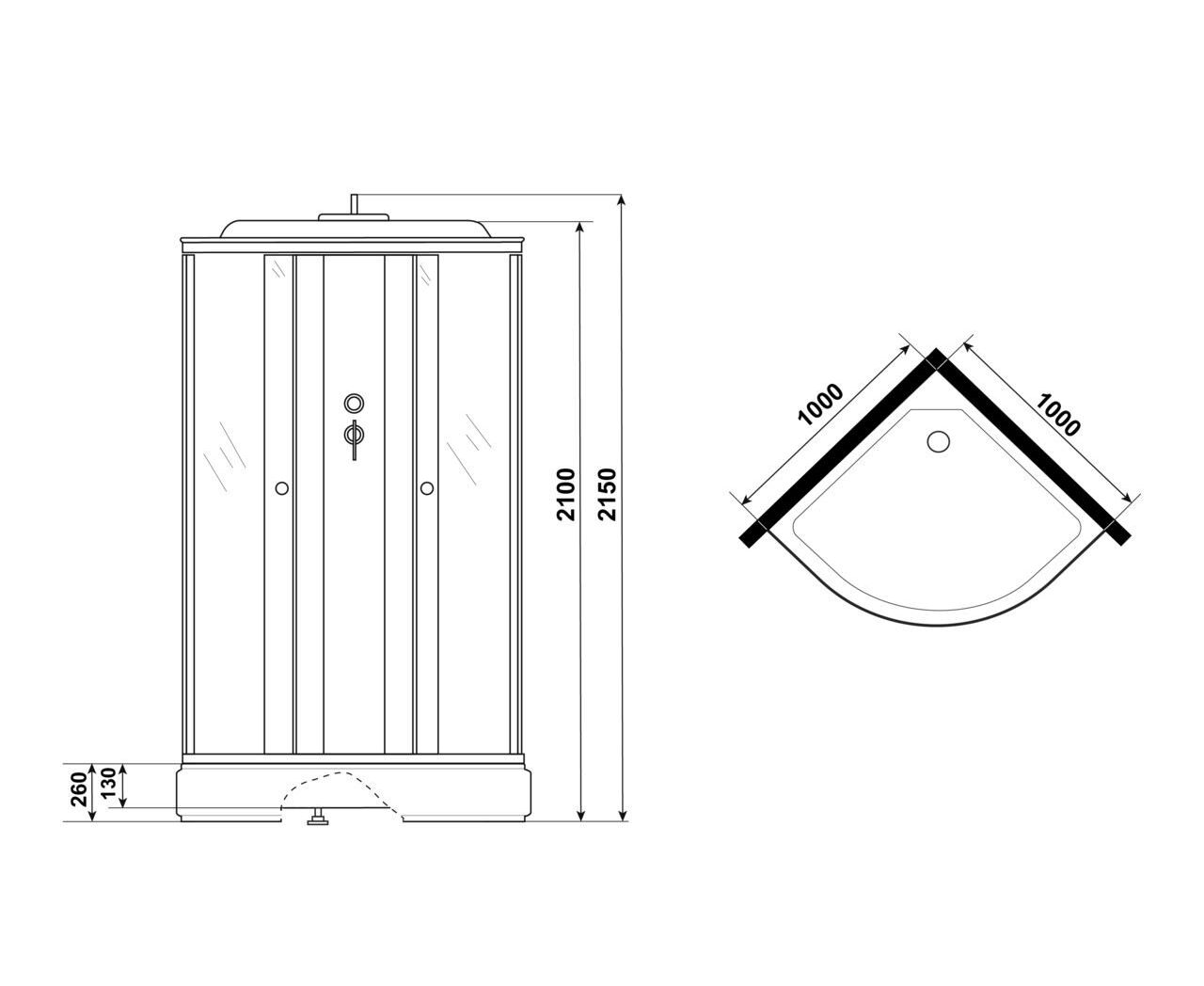 Niagara Eco E100/26/MT - угловая душевая кабина с крышей (100х100х215 см), форма - четверть круга. Средний поддон (высота 26 см, глубина 13 см) с антискользящим покрытием, матовое закалённое стекло 4 мм, задняя стенка - белое закалённое крашеное стекло. Раздвижные двери, матовый хромированный алюминиевый профиль. В комплекте: ручная лейка, тропический (верхний) душ, полочка. Нагрузка на поддон до 350 кг. Бессиликоновая сборка, съёмный экран, гарантия 10 лет.