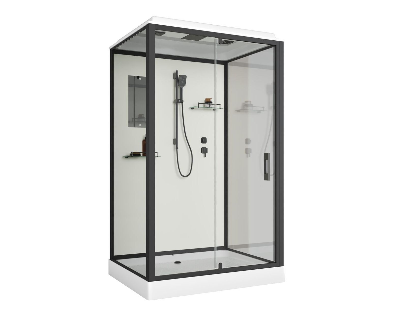Niagara Standart ST100/80/15Q/BL - прямоугольная душевая кабина с крышей (100х80х215 см), пристенно-фронтальное расположение. Низкий акриловый поддон (высота 15 см) с антискользящим покрытием, прозрачное закалённое стекло 5 мм, задняя стенка - белое закалённое крашеное стекло. Распашная дверь, матовый чёрный алюминиевый профиль. В комплекте: ручная лейка, тропический (верхний) душ, зеркало, две полочки. Нагрузка на поддон до 350 кг. Бессиликоновая сборка, гарантия 10 лет.