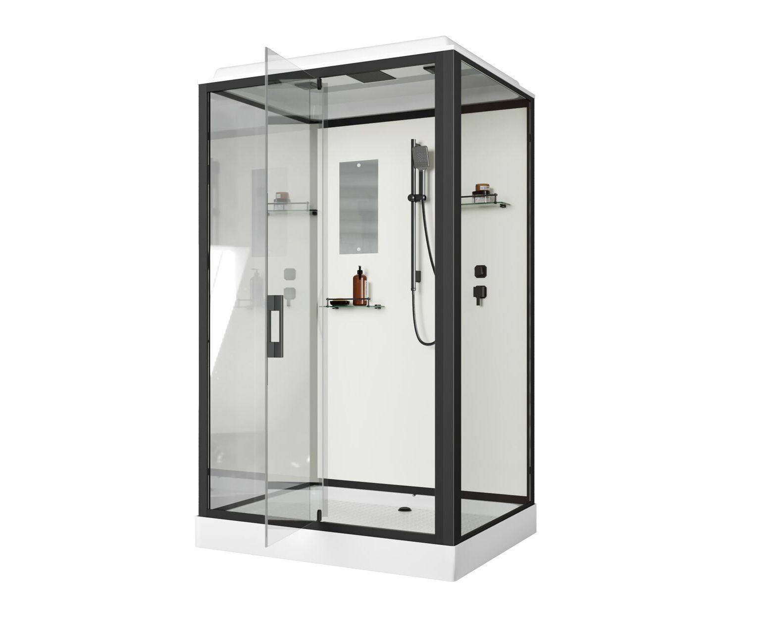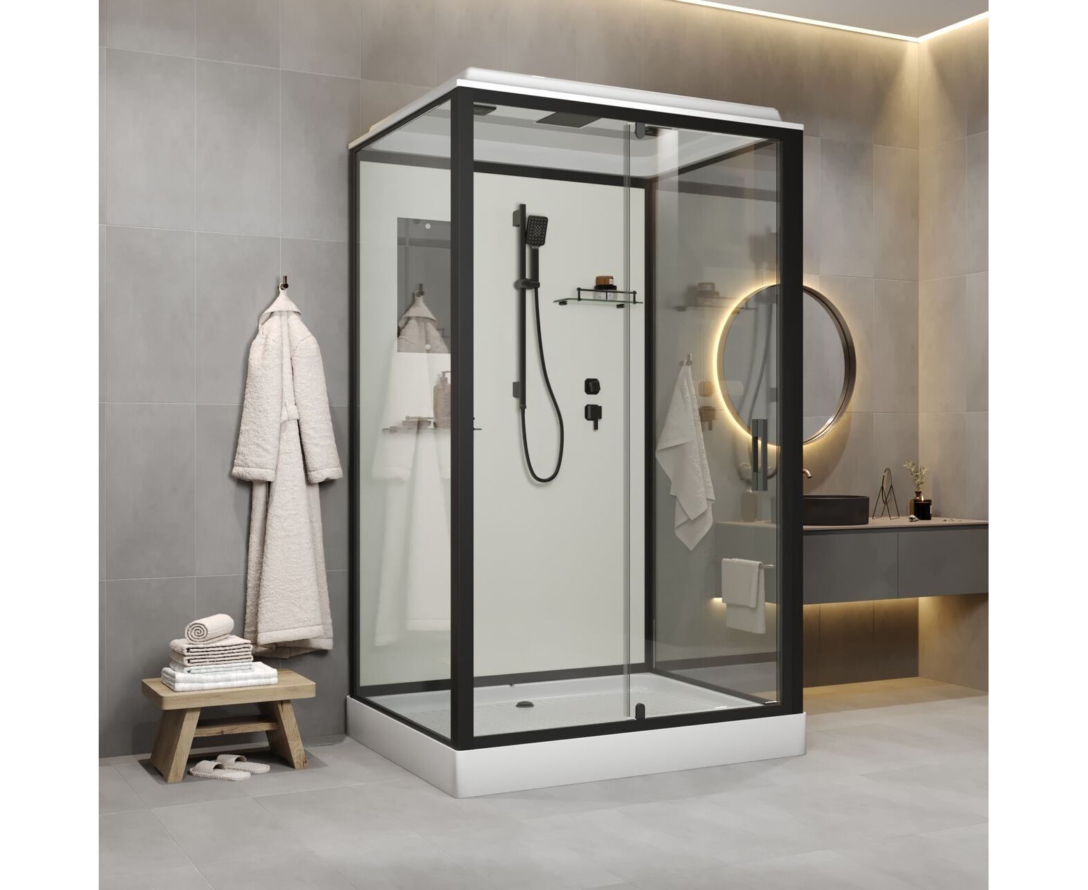 Niagara Standart ST120/90/15Q/BL - прямоугольная душевая кабина с крышей (120х90х215 см), пристенно-фронтальное расположение. Низкий акриловый поддон (высота 15 см) с антискользящим покрытием, прозрачное закалённое стекло 5 мм, задняя стенка - белое закалённое крашеное стекло. Распашная дверь, матовый чёрный алюминиевый профиль. В комплекте: ручная лейка, тропический (верхний) душ, зеркало, две полочки. Нагрузка на поддон до 350 кг. Бессиликоновая сборка, гарантия 10 лет.