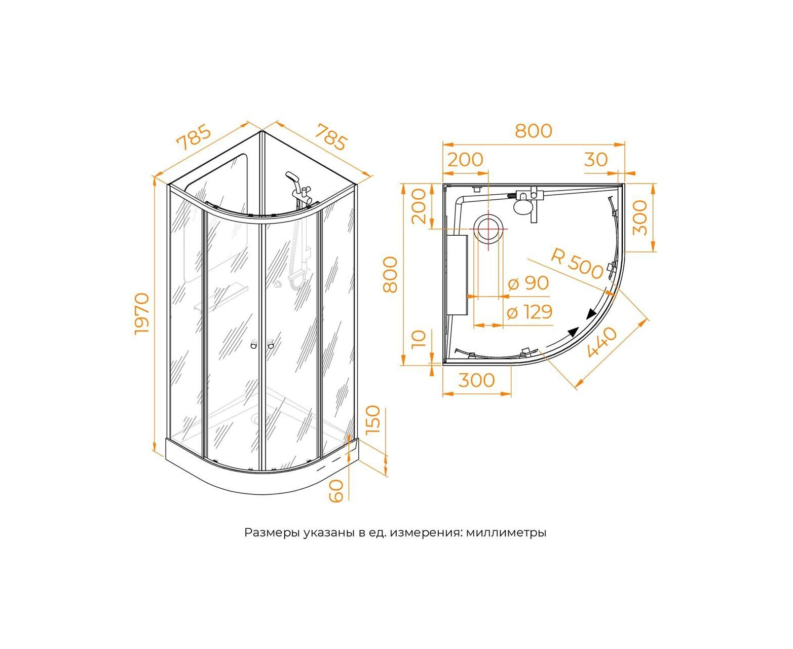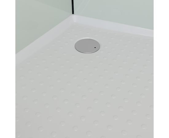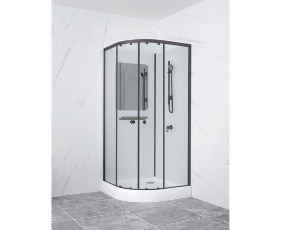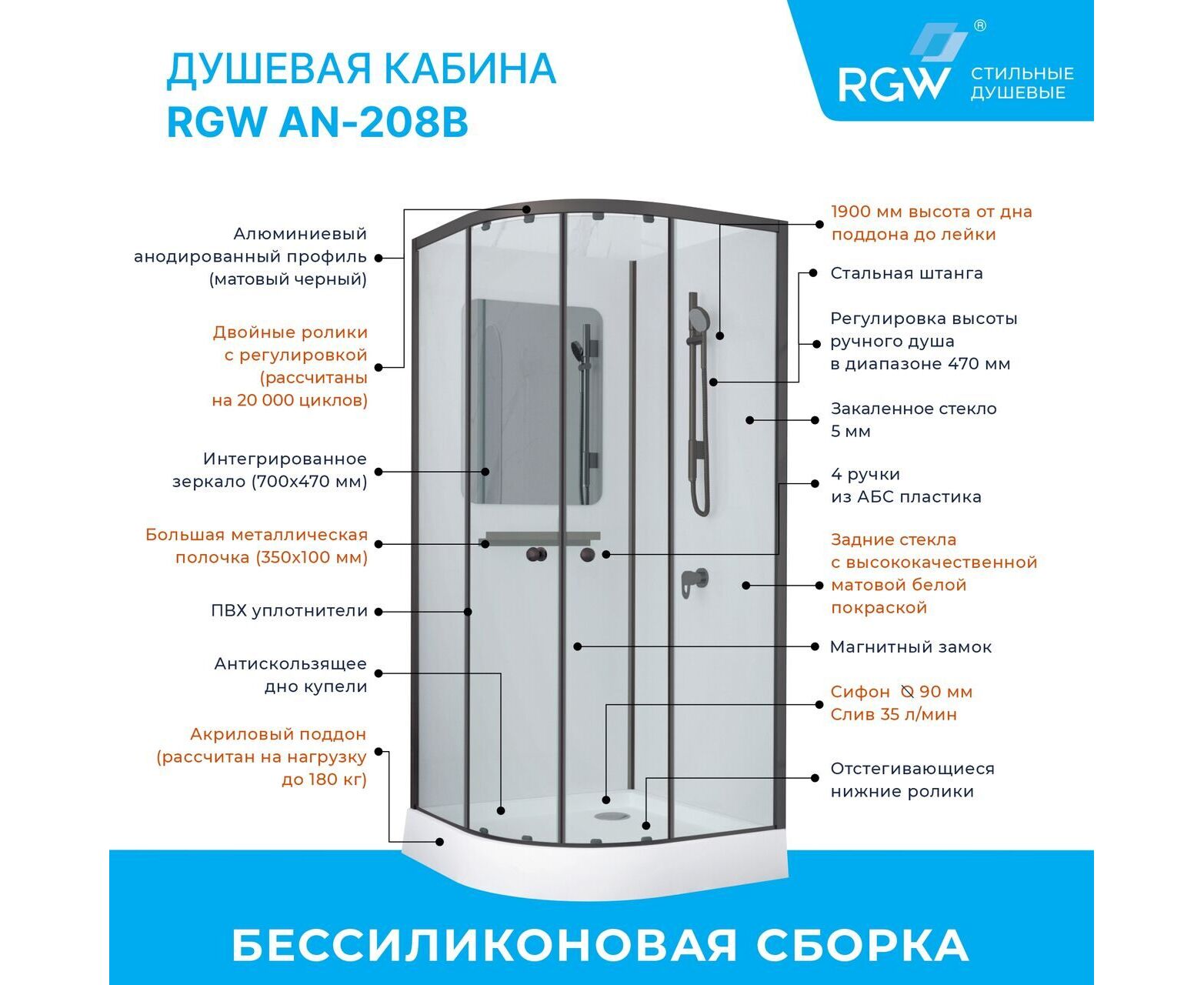 Без силиконовая сборка. Алюминиевый профиль Сатин (Матовый хром). 5 мм прозрачное закаленное стекло двери. Белое окрашенное закаленное стекло толщиной 5 мм для задней панели (одна панель с зеркальным покрытием). Встроенное зеркало. Ручной душ со штангой и душевой шланг 1,5 м (смеситель, ручной душ, стойка, шланг). Верхние двойные и нижние одинарные ролики. Алюминиевая полка. Хромированная ручка. Душевой поддон с 90 мм сифоном. Две раздвижные двери. Поддон выдерживает вес до 150 кг.
