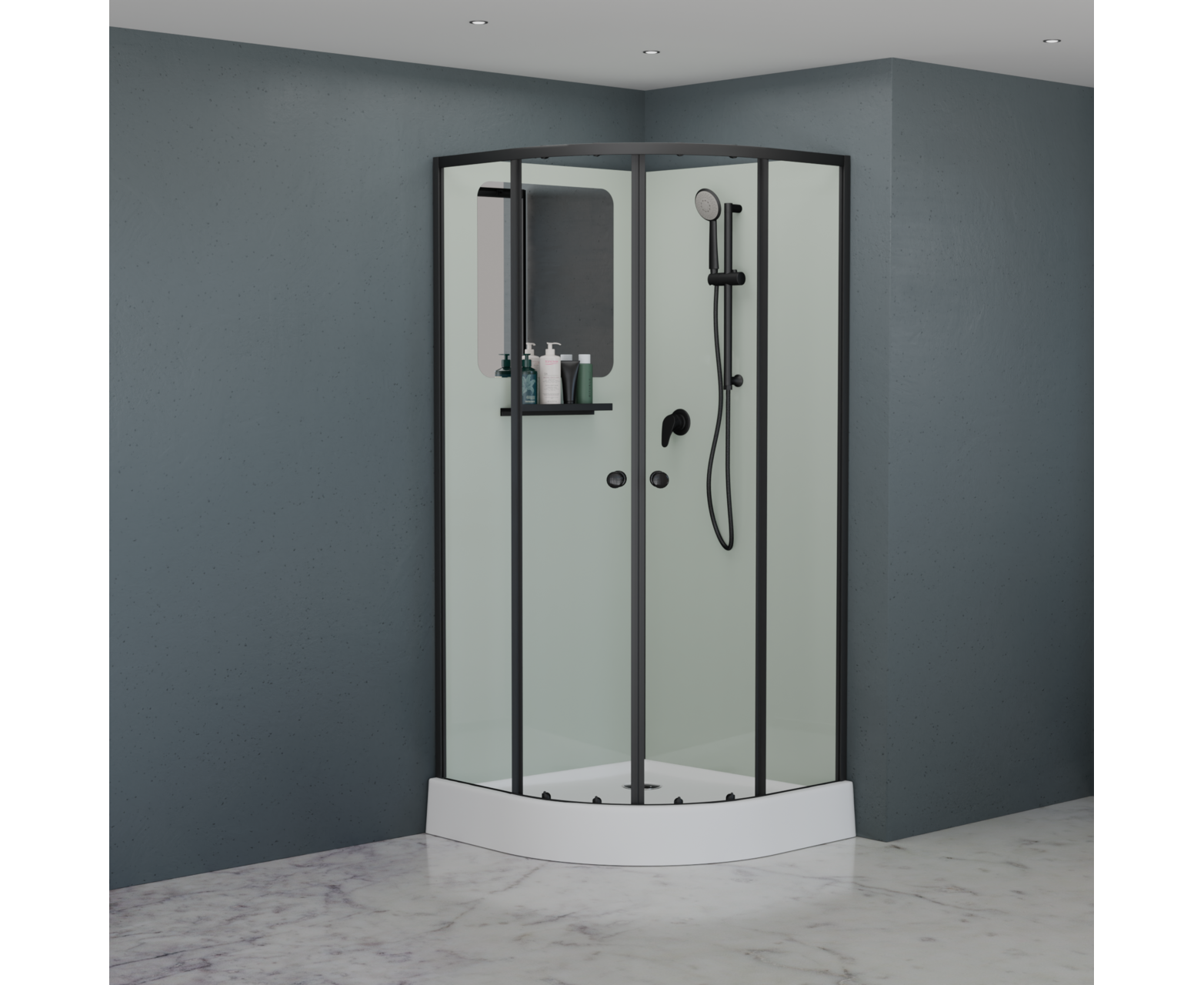 Без силиконовая сборка. Алюминиевый профиль Сатин (Матовый хром). 5 мм прозрачное закаленное стекло двери. Белое окрашенное закаленное стекло толщиной 5 мм для задней панели (одна панель с зеркальным покрытием). Встроенное зеркало. Ручной душ со штангой и душевой шланг 1,5 м (смеситель, ручной душ, стойка, шланг). Верхние двойные и нижние одинарные ролики. Алюминиевая полка. Хромированная ручка. Душевой поддон с 90 мм сифоном. Две раздвижные двери. Поддон выдерживает вес до 150 кг.
