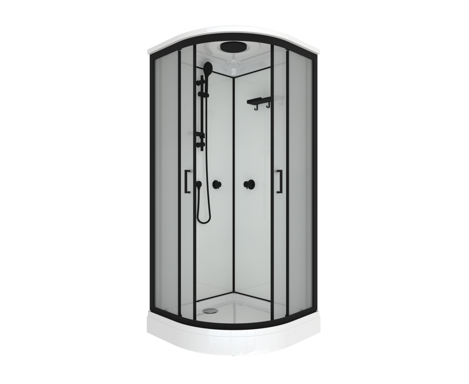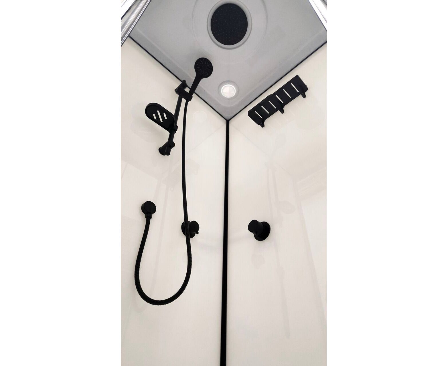 Комплектация: сифон, душевой набор с лейкой на гибком шланге и верхним душем, полочка с крючками, поддон с бортиком.