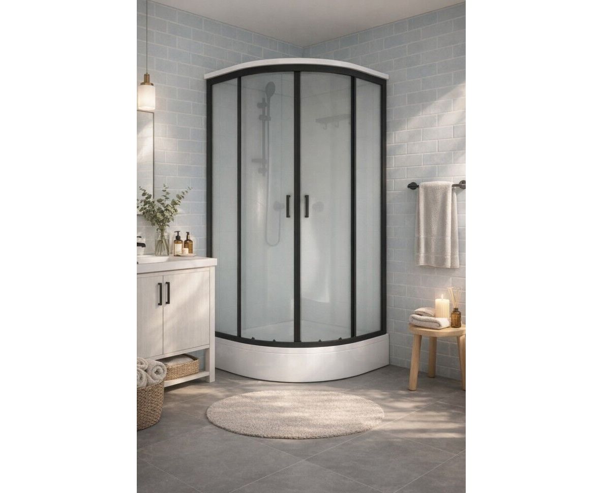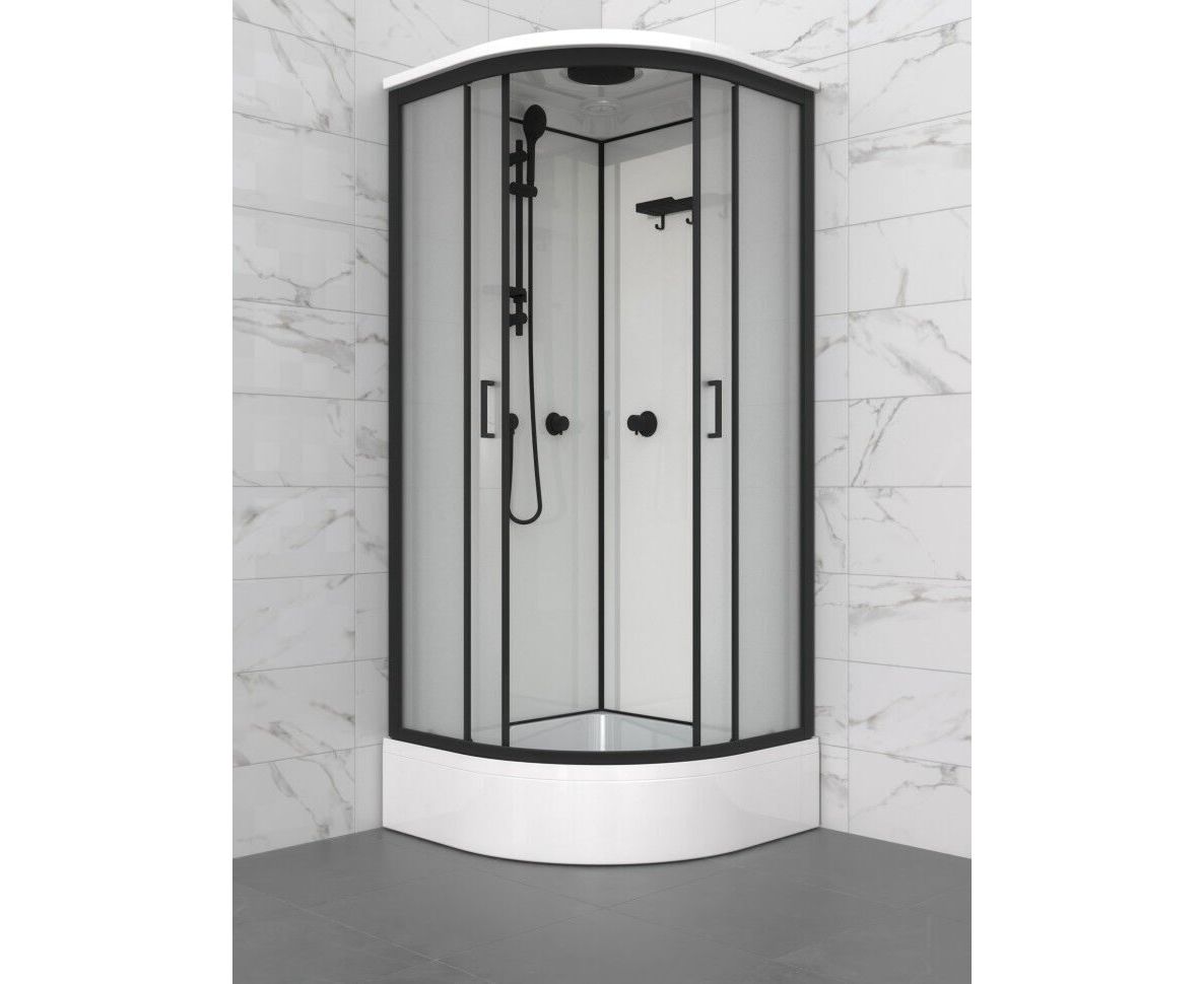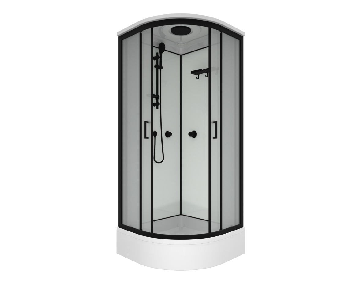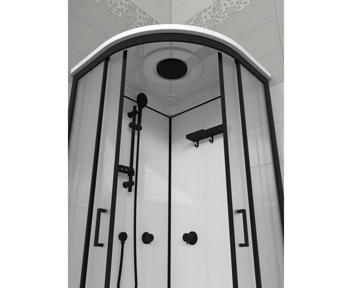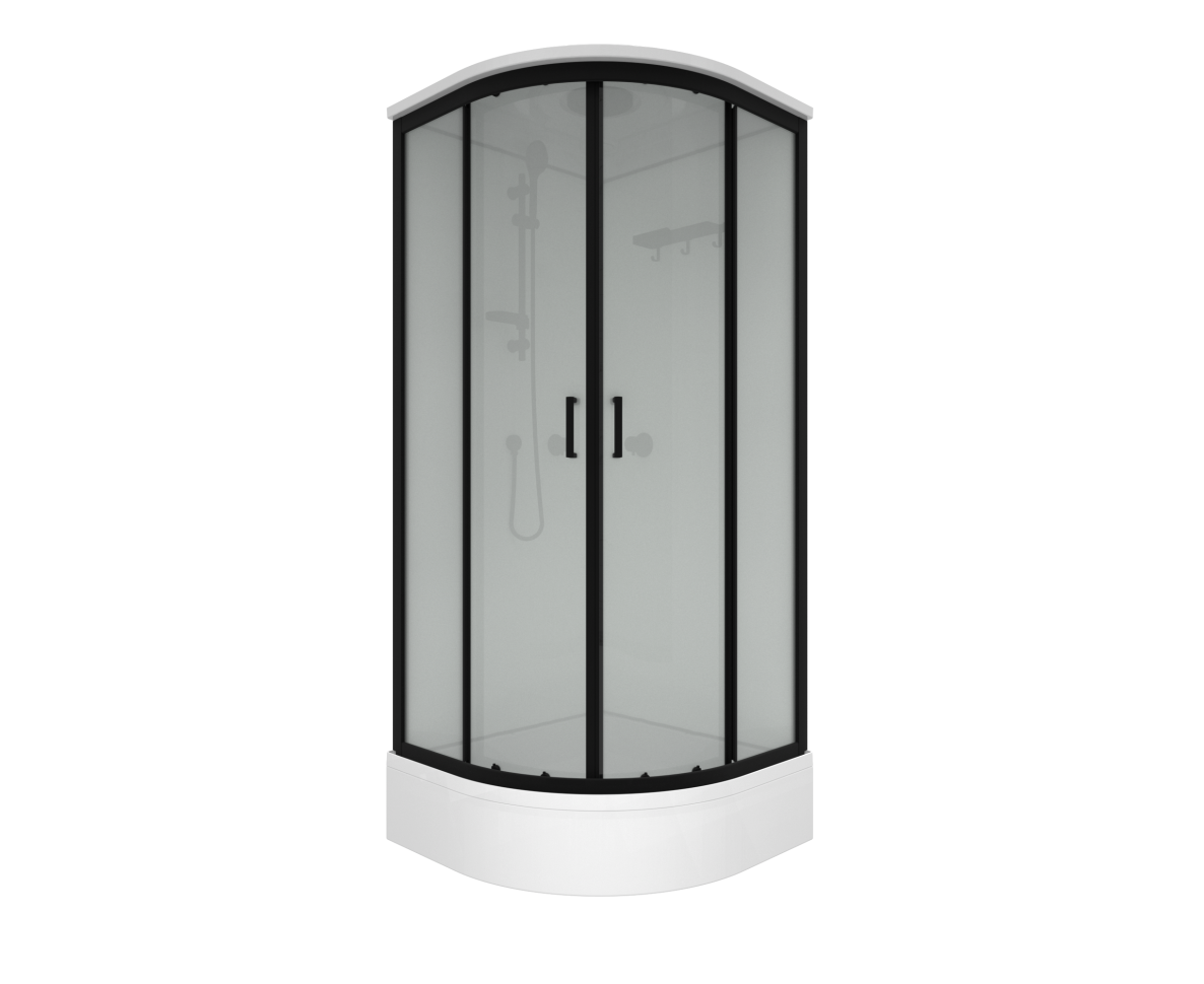 Triton Прайм-Блэк-Вельвет М3 - душевая кабина в форме полукруга (90х90х228 см). Средний поддон (высота 25,5 см, глубина 14,5 см) с сифоном 50 мм. Закалённое стекло 4 мм с рисунком «Вельвет», две раздвижные двери на роликах скольжения, ширина проёма 51 см. Алюминиевый профиль чёрного цвета, радиус кабины - 556 мм. Максимальная нагрузка на поддон - 350 кг.