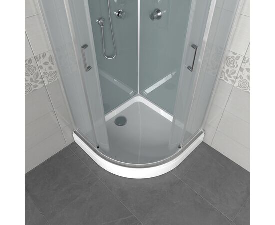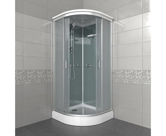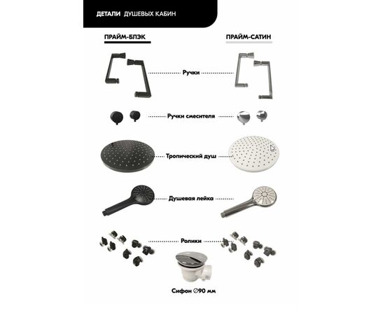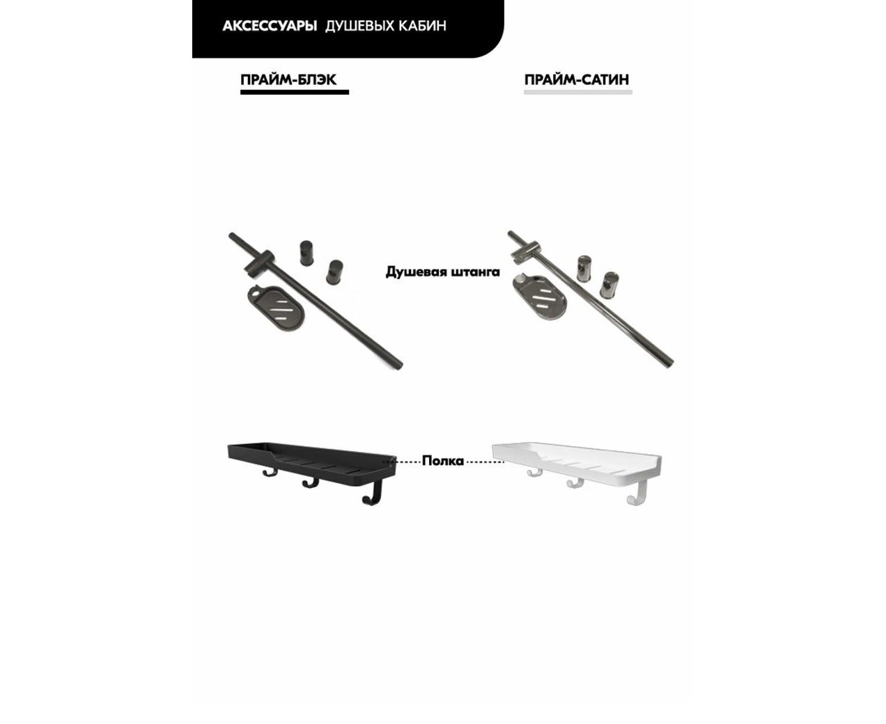 Комплектация: сифон, душевой набор с лейкой на гибком шланге и верхним душем, полочка с крючками, поддон с бортиком.