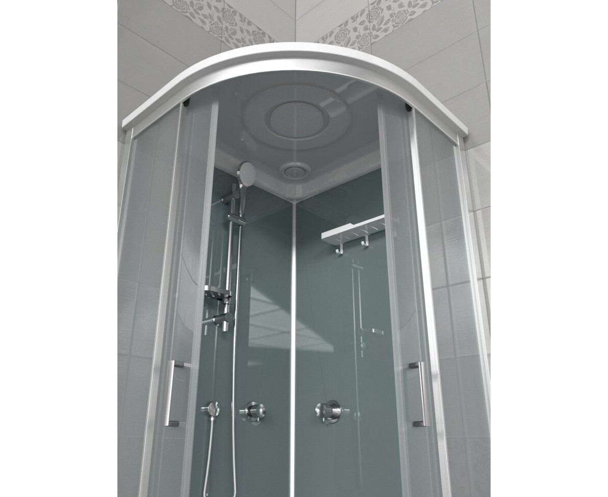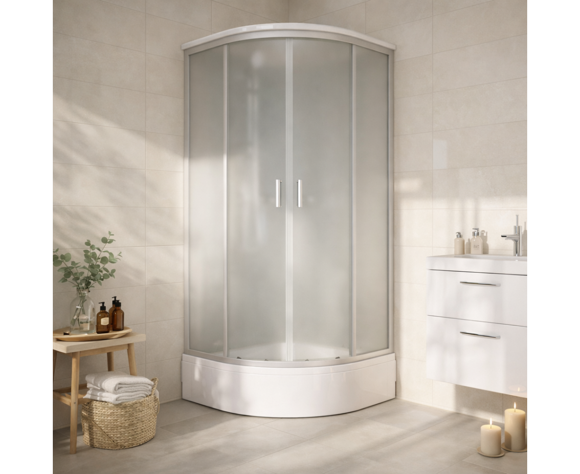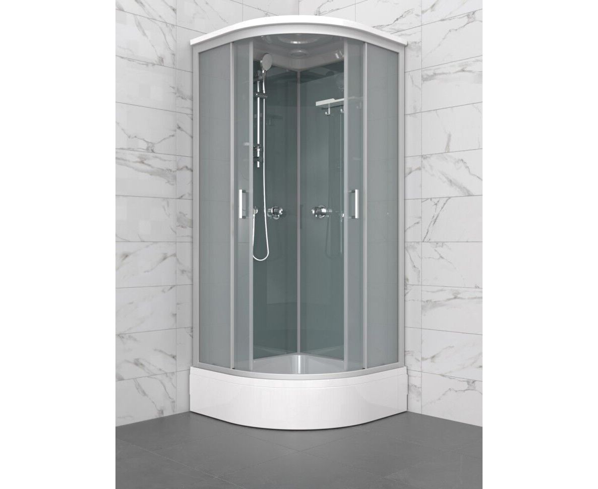 Triton Прайм-Сатин-Вельвет М3 - душевая кабина в форме полукруга (90х90х228 см). Средний поддон (высота 25,5 см, глубина 14,5 см) с сифоном 50 мм. Закалённое стекло 4 мм с рисунком «Вельвет», две раздвижные двери на роликах скольжения, ширина проёма 51 см. Алюминиевый профиль цвета сатин, радиус кабины - 556 мм. Максимальная нагрузка на поддон - 350 кг.