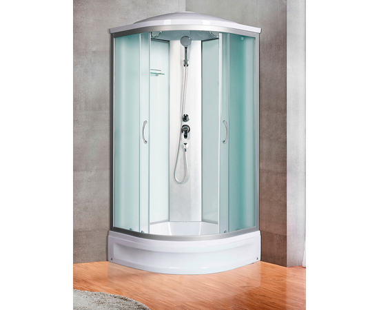 Угловая душевая кабина River Desna 90/24 MT от производителя River отличное решение для Вашей ванной комнаты. Кабина закрытого типа, габаритные размеры 90x90x210. Поддон средний. Матовое стекло толщиной 4 мм в хромированном алюминиевом профиле не только эффектно смотрится, но и практично в эксплуатации. Раздвижные двери открываются бесшумно и не заедают. Кабина оснащена всем необходимым для приема душа: сифон, полочка, передний съемный экран, душевой гарнитур.