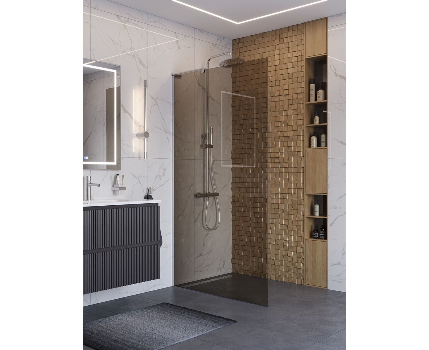 L-образный кронштейн сохраняет минималистичный вид и не загромождает пространство, оставаясь практически незаметным в душевой зоне.