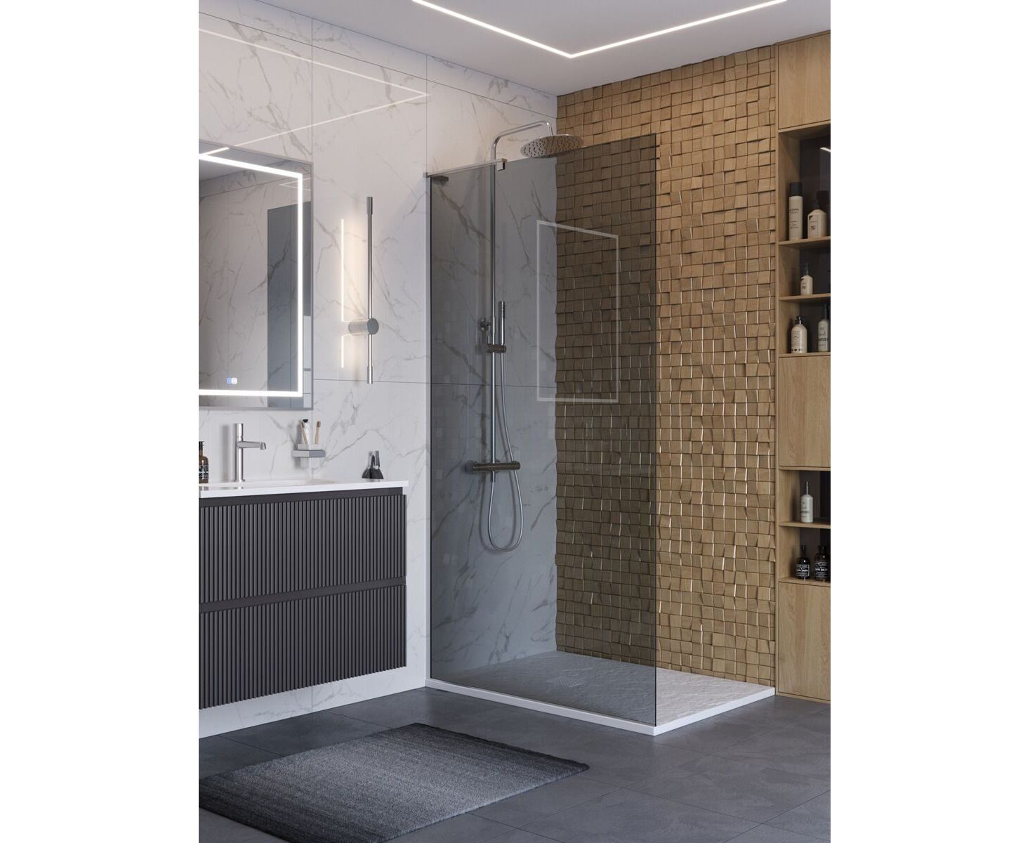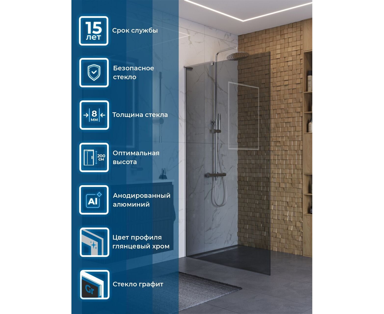 Широкий диапазон размеров от 60 до 110 см с шагом в 10 см позволяет найти идеальное решение для ванных комнат любого метража. Высота перегородок составляет целых 200 см — как в премиальных коллекциях.