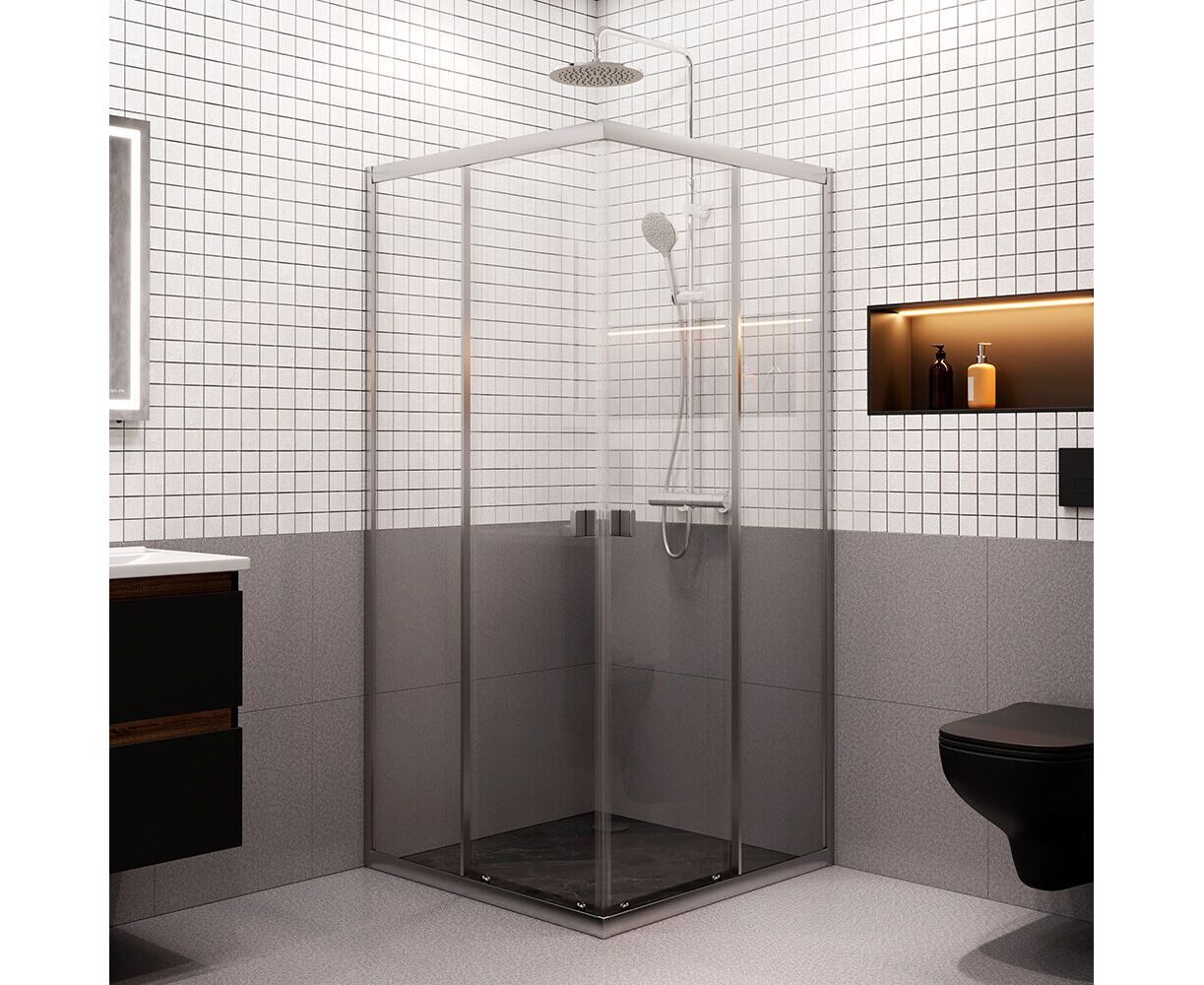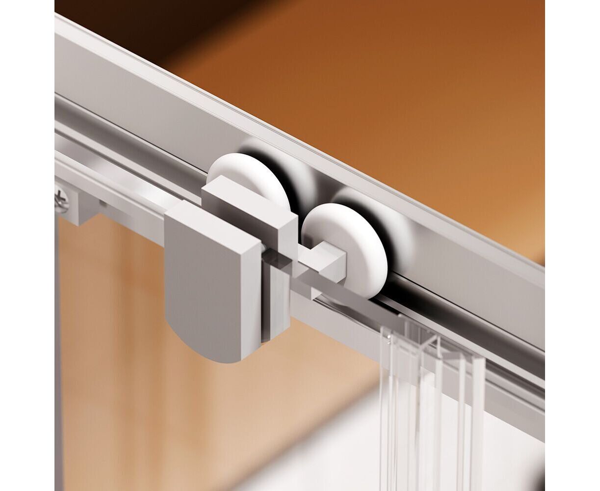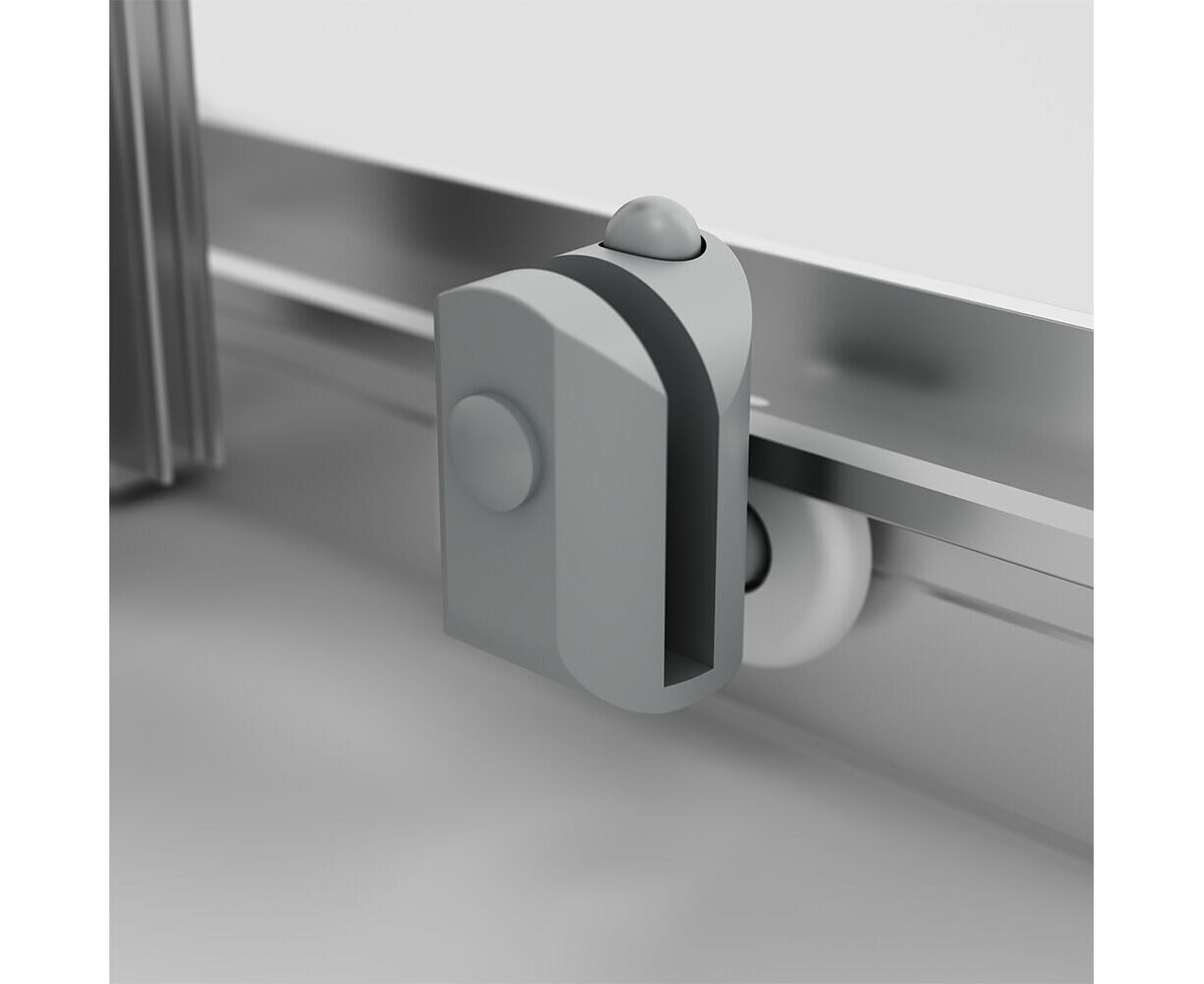 Ограждение имеет сверхпрочные закаленные стёкла. Толщина стекол составляет 5 мм. Невероятно плавное и легкое открывание двери благодаря двойным усиленным роликам из ABS-пластика. Нижние ролики обладают функцией быстрого снятия для самой лёгкой уборки. Магнитные уплотнители дверей делают ограждение полностью герметичным и предотвращают попадание воды за пределы душевой зоны.