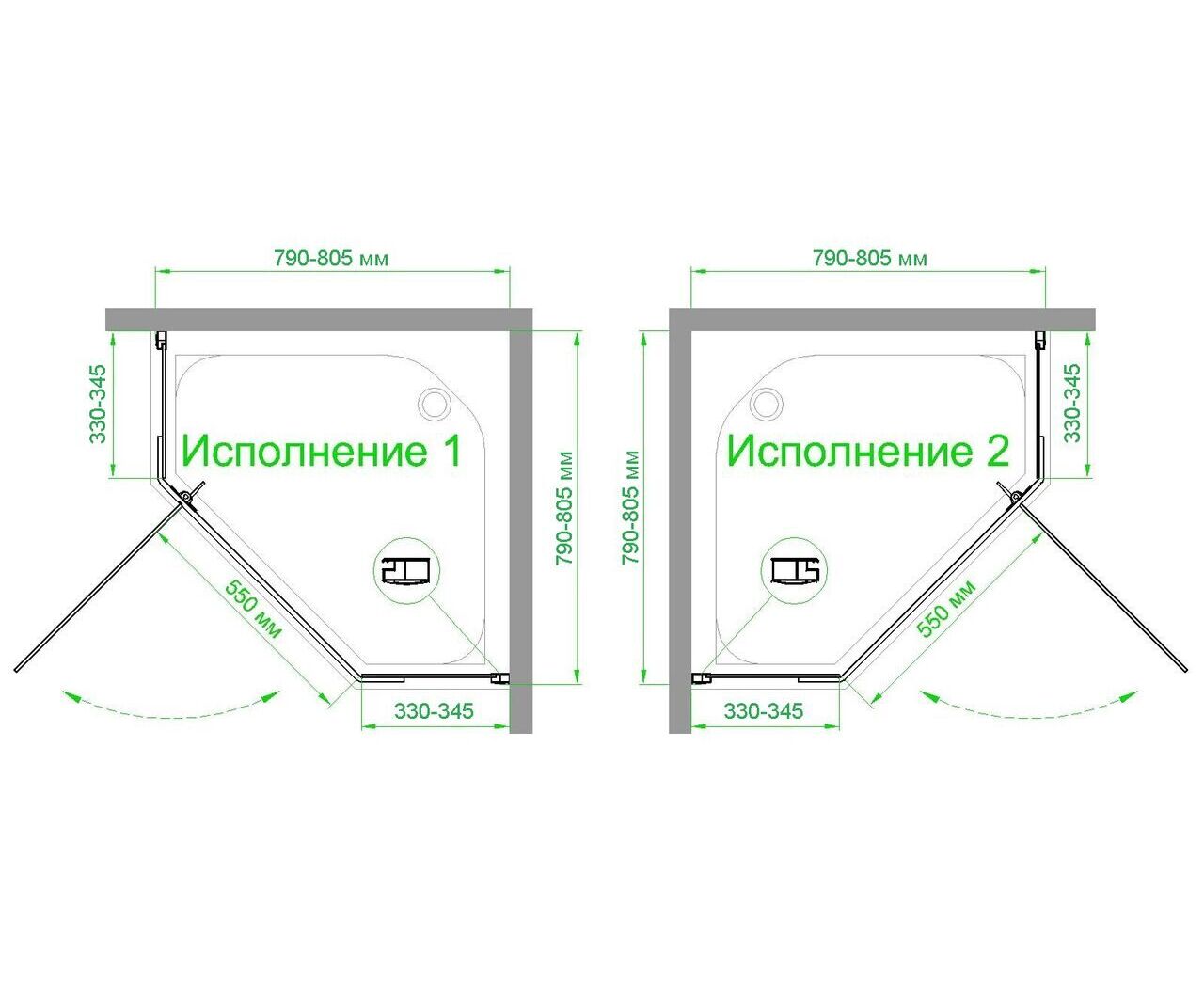 Материал полотна двери: стекло. Исполнение полотна двери: прозрачное. Вход: спереди . Ширина входа, см: 55. Толщина полотна двери, мм: 6. Конструкция дверей: распашная. Количество секций двери: 1. Монтаж: пристенный в угол.