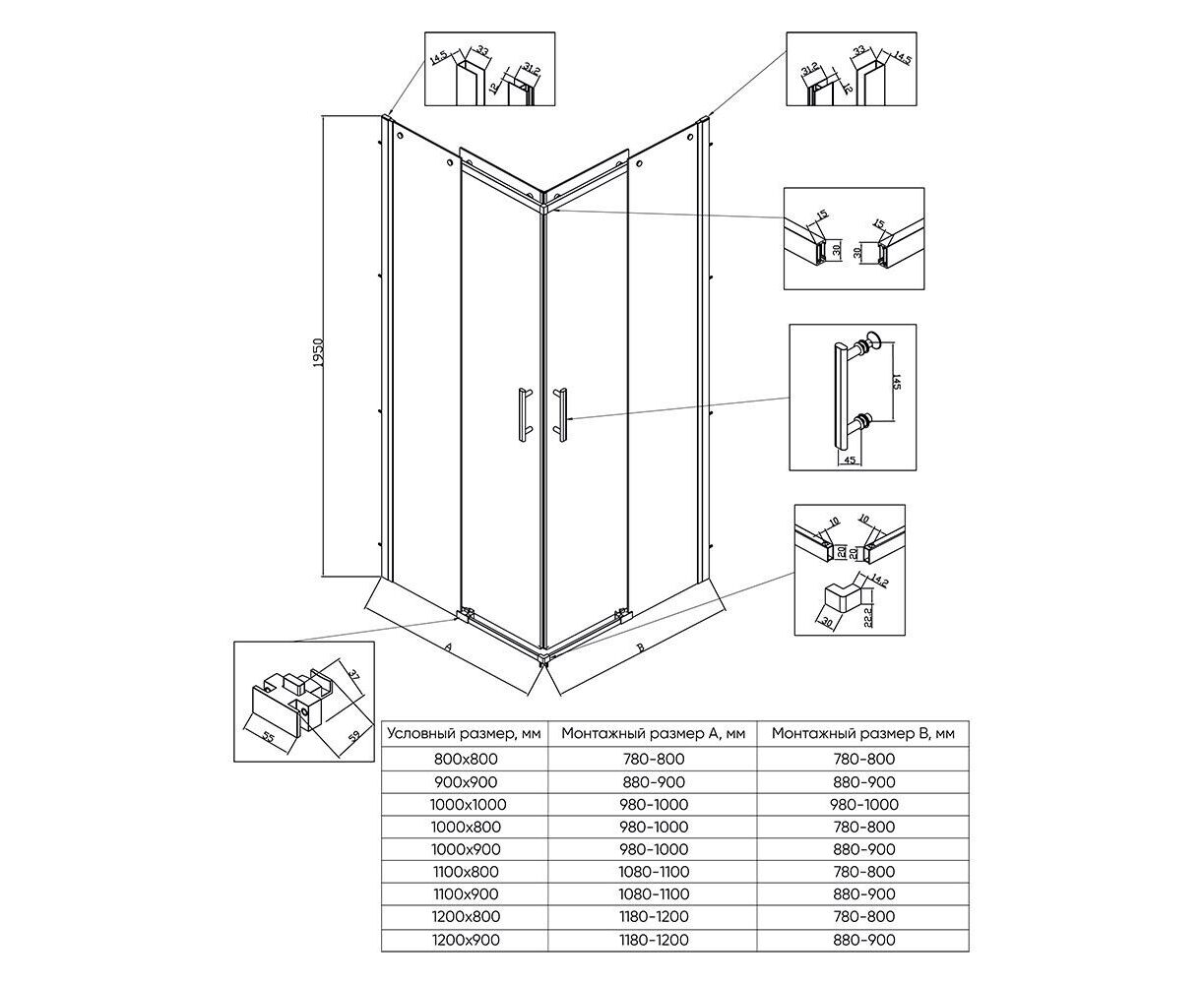 Поддон в комплекте: нет, приобретается отдельно. Монтаж: пристенный, в угол, на поддон, напольный (без поддона). Регулируемая ширина: 980-1000х880-900 мм.