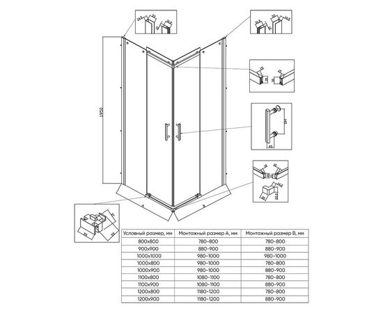 Поддон в комплекте: нет, приобретается отдельно. Монтаж: пристенный, в угол, на поддон, напольный (без поддона). Регулируемая ширина: 1080-1100х780-800 мм.