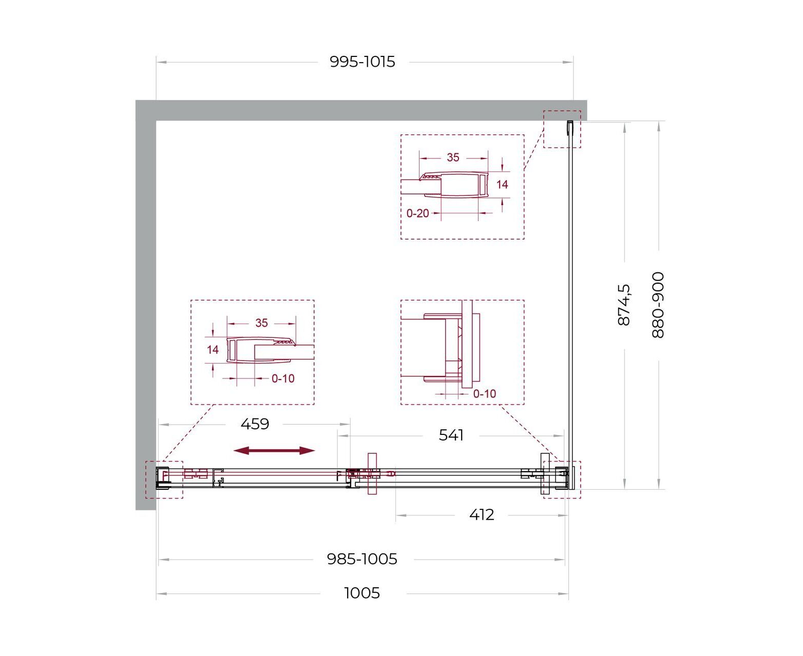 Система подвески: Двойные навесные ролики из нержавеющей стали с держателем стекла обеспечивают плавное движение створки, ее устойчивость и отсутствие перекосов.