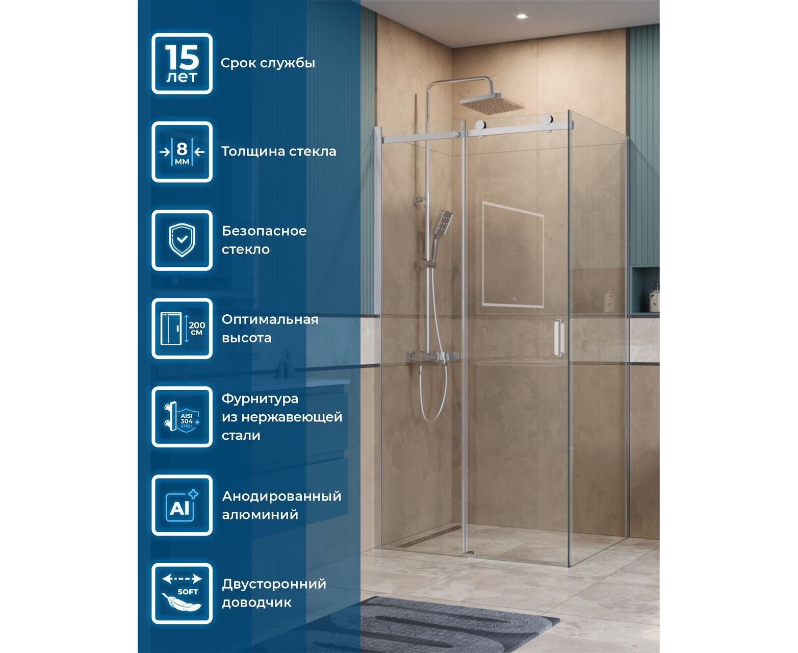 Надёжное и безопасное стекло: прозрачное, высокотемпературной закалки, толщиной 8 мм, что обеспечивает его прочность и безопасность.