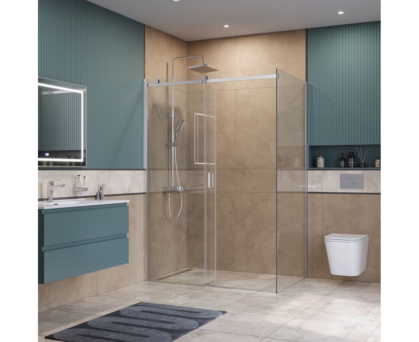 Коллекция сохраняет все преимущества минималистичного дизайна: минимум деталей, узкие профили и прозрачное стекло, которое не перегружает пространство, подчёркивая ощущение простора в ванной. Особая фишка - ролики увеличенного диаметра, обеспечивающие сверх плавное и бесшумное скольжение стеклянной панели без малейших усилий. Эти крупные элементы визуально доминируют, добавляя ограждению нотку надёжности и индустриальной эстетики в минималистичном стиле. Благодаря им ощущается лёгкость движения двери, усиливающая общее впечатление роскоши и стабильности, будто конструкция парит.