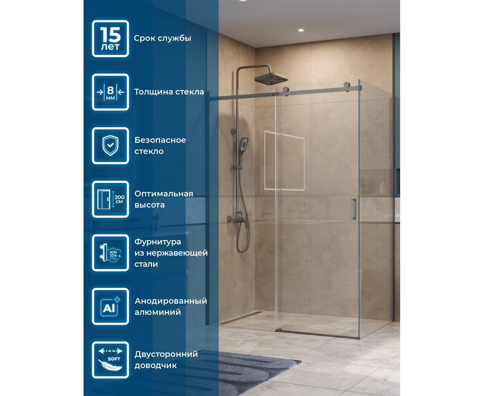 Коллекция сохраняет все преимущества минималистичного дизайна: минимум деталей, узкие профили и прозрачное стекло, которое не перегружает пространство, подчёркивая ощущение простора в ванной. Особая фишка - ролики увеличенного диаметра, обеспечивающие сверх плавное и бесшумное скольжение стеклянной панели без малейших усилий. Эти крупные элементы визуально доминируют, добавляя ограждению нотку надёжности и индустриальной эстетики в минималистичном стиле. Благодаря им ощущается лёгкость движения двери, усиливающая общее впечатление роскоши и стабильности, будто конструкция парит.