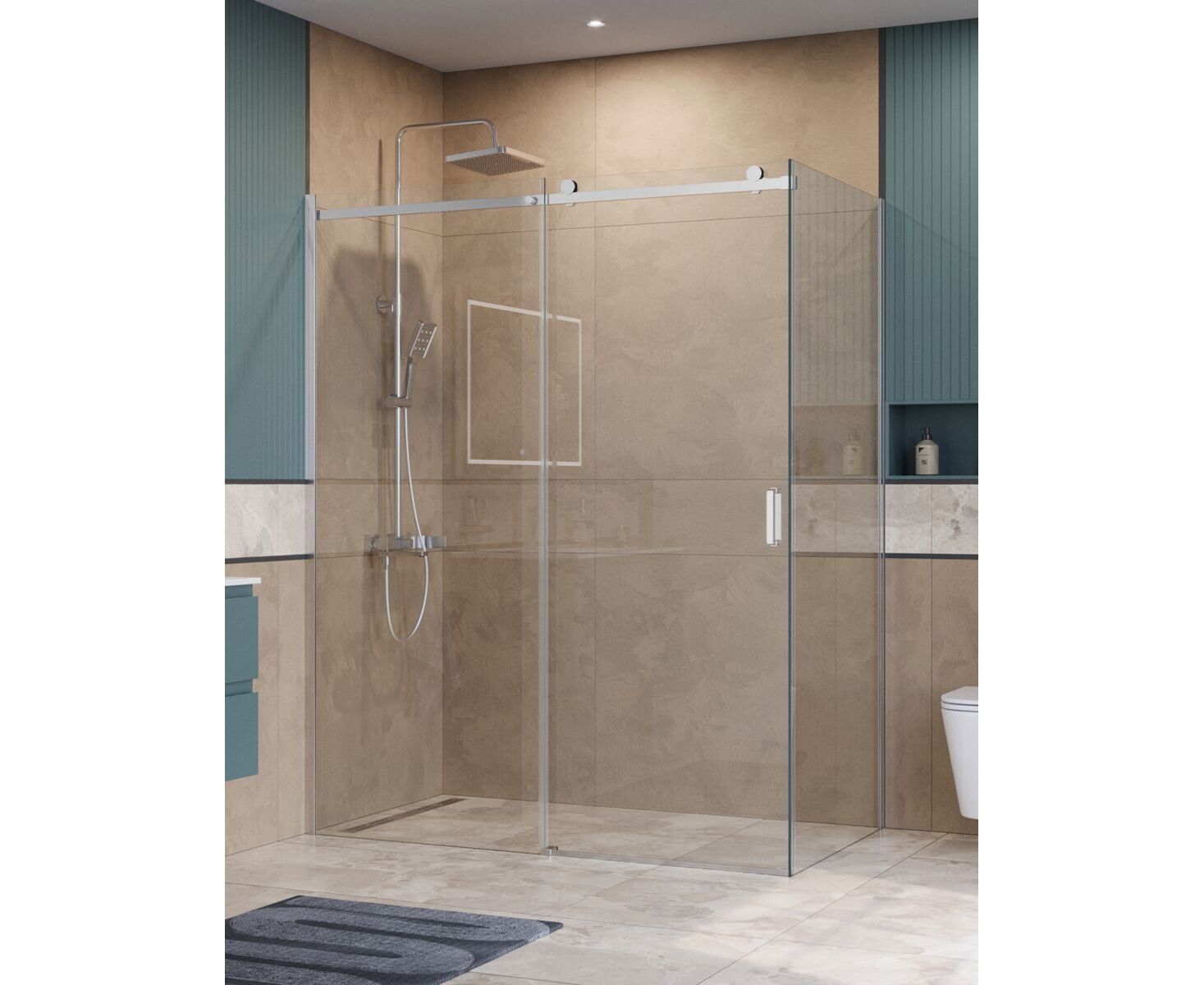 Коллекция сохраняет все преимущества минималистичного дизайна: минимум деталей, узкие профили и прозрачное стекло, которое не перегружает пространство, подчёркивая ощущение простора в ванной. Особая фишка - ролики увеличенного диаметра, обеспечивающие сверх плавное и бесшумное скольжение стеклянной панели без малейших усилий. Эти крупные элементы визуально доминируют, добавляя ограждению нотку надёжности и индустриальной эстетики в минималистичном стиле. Благодаря им ощущается лёгкость движения двери, усиливающая общее впечатление роскоши и стабильности, будто конструкция парит.