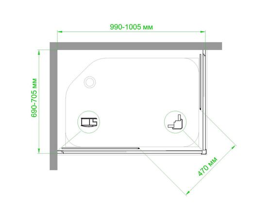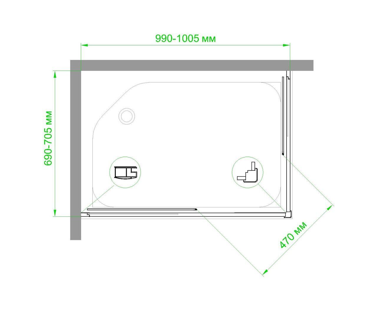 Материал полотна двери: стекло. Монтаж: пристенный в угол, напольный. Вход: спереди. Регулируемая ширина: да.