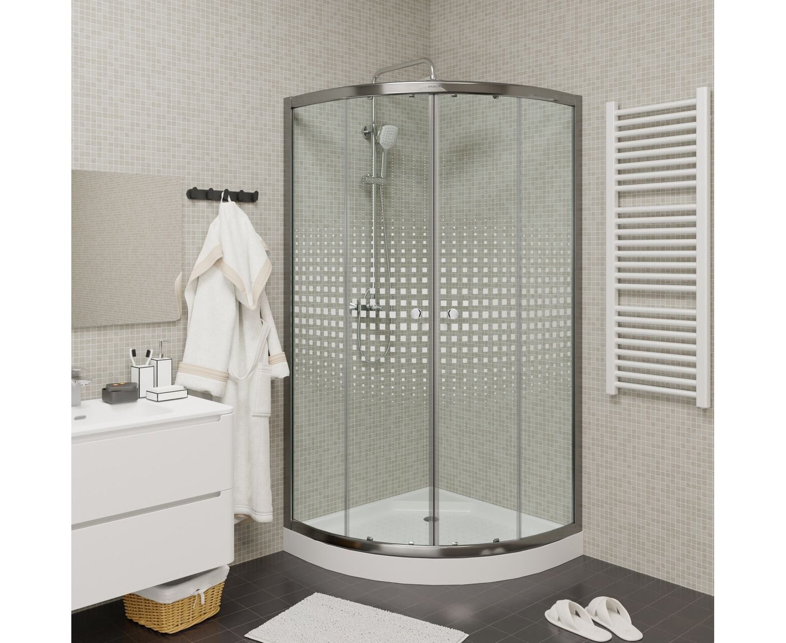 Уголок из прозрачного стекла с дизайнерским рисунком отлично дополнит оформление ванной комнаты. Закругленная форма экономит полезную площадь в санузле.