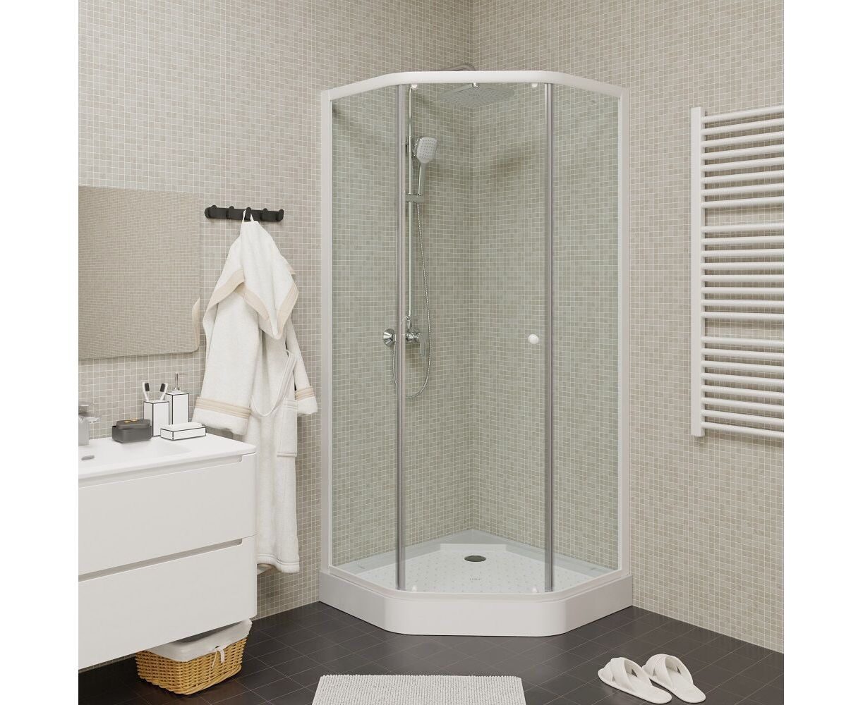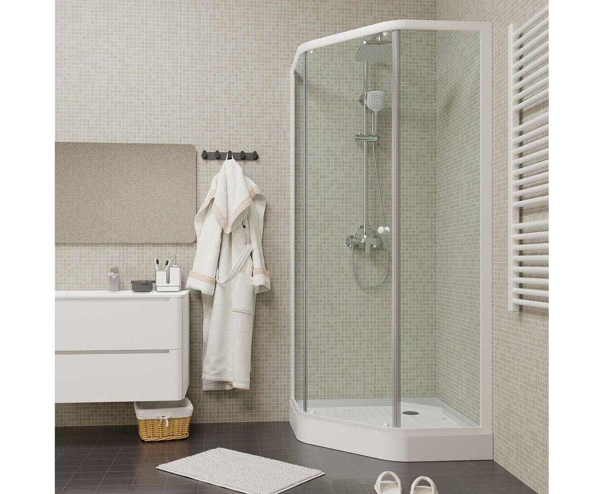 Белый профиль и прозрачное стекло придают уголку визуальную невесомость. Благодаря универсальному дизайну, уголок не будет перетягивать на себя внимание от общей идеи оформления ванной. За счет трапециевидной формы модель занимает мало места, но внутри комфортно принимать душ.