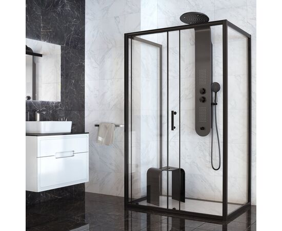 Форма: прямоугольник. Количество секций двери: 1. Конструкция дверей: раздвижные. Верхние ролики: двойные. Нижние ролики: двойные с кнопкой. Ширина входа, см: . Цвет профиля: матовый черный. Материал профиля: алюминий. Материал стенок и дверей: закаленное стекло. Толщина стекла, мм: 6. Декор стекол: прозрачное. Тип монтажа: на пол или поддон.