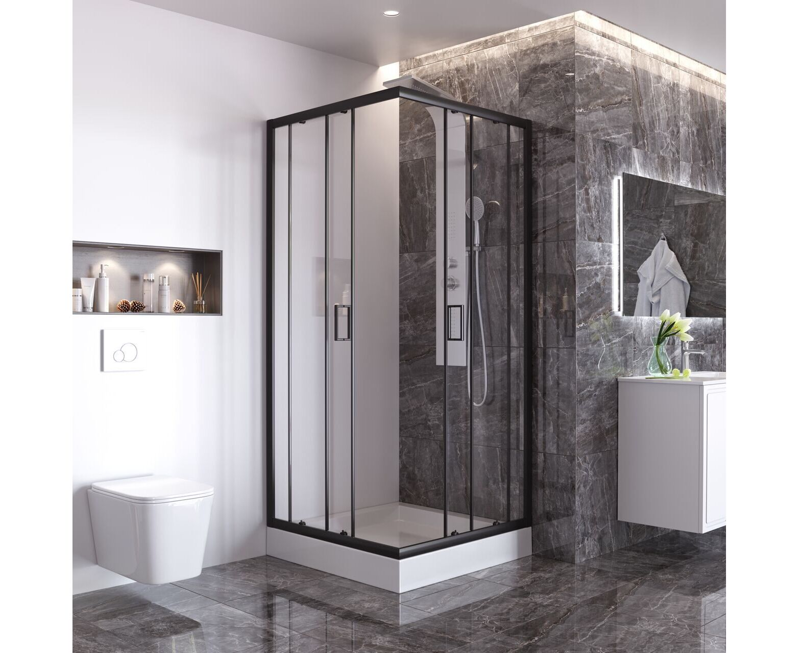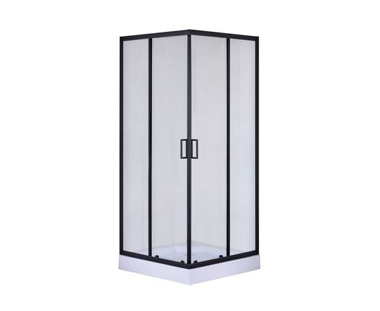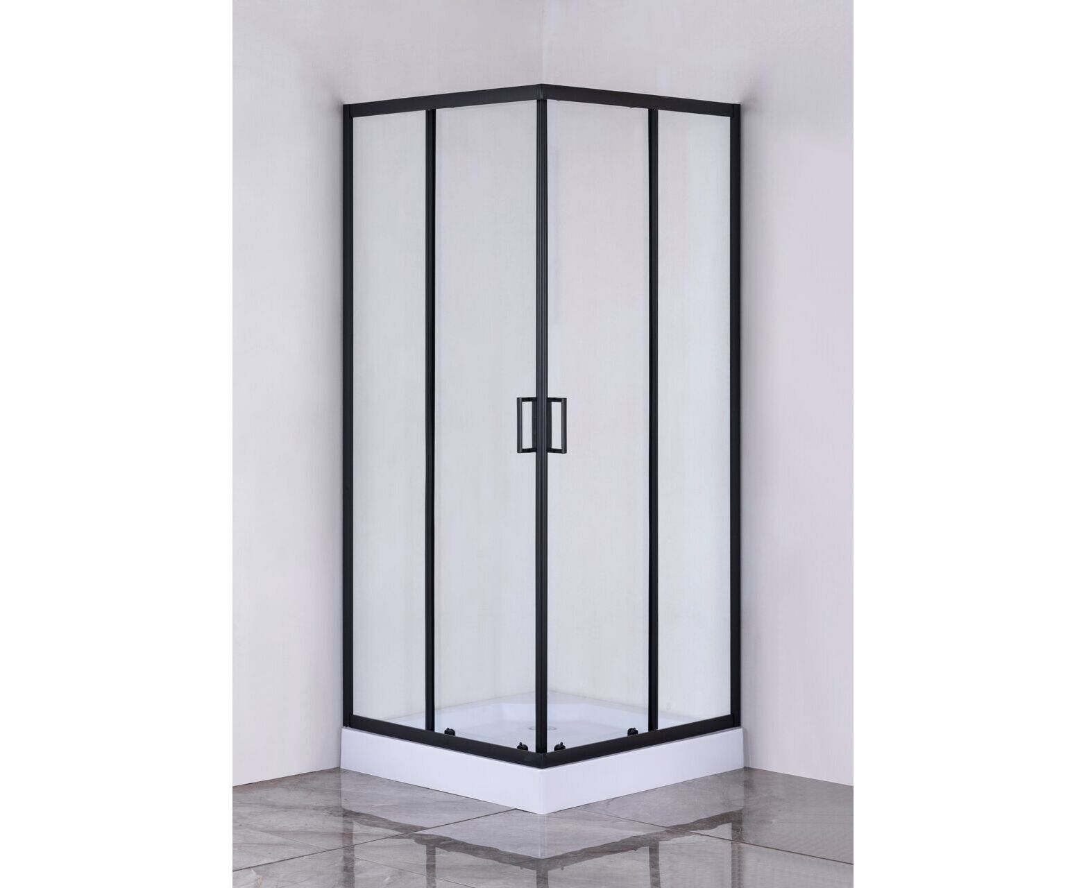 Форма: квадрат. Количество секций двери: 2. Конструкция дверей: раздвижные. Верхние ролики: двойные. Нижние ролики: двойные с кнопкой. Ширина входа, см: 44. Цвет профиля: матовый черный. Материал профиля: алюминий. Материал стенок и дверей: закаленное стекло. Толщина стекла, мм: 6. Декор стекол: прозрачное. Тип монтажа: на пол или поддон.