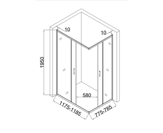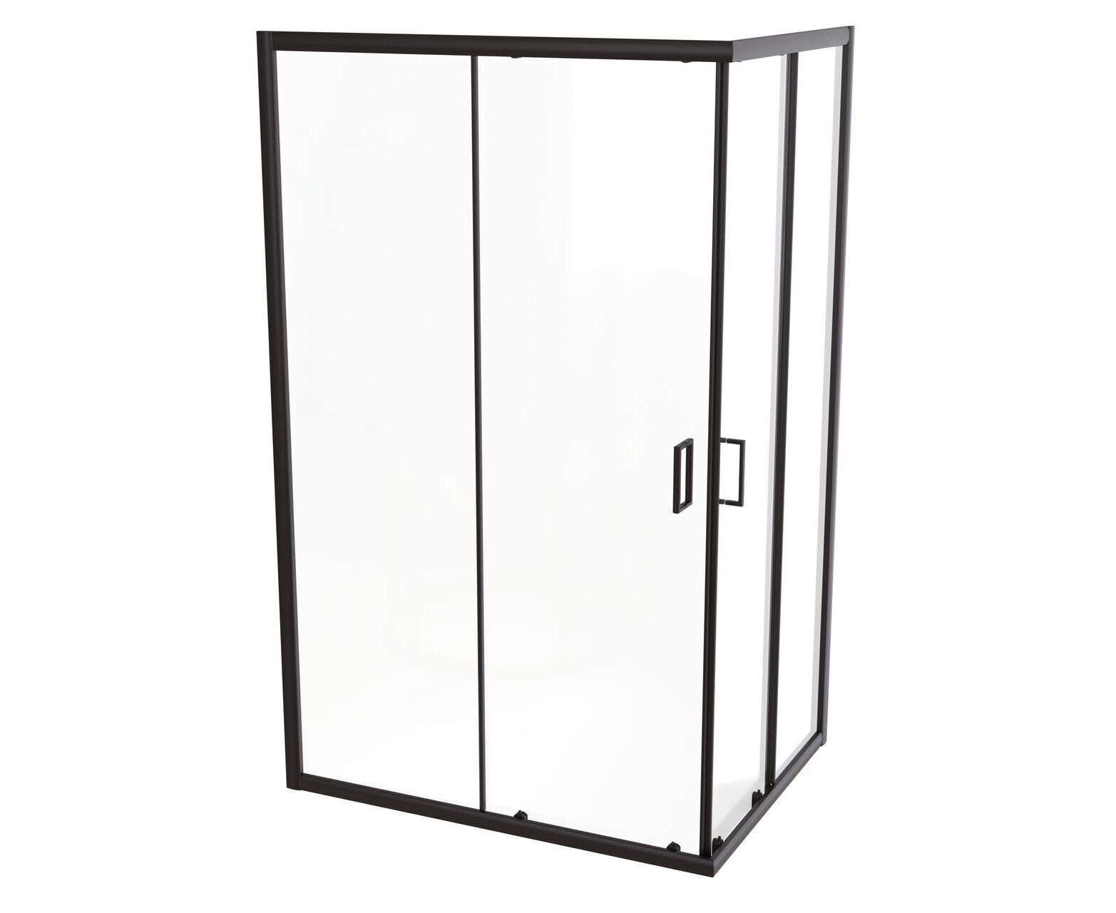Форма: прямоугольник. Количество секций двери: 2. Конструкция дверей: раздвижные. Верхние ролики: двойные. Нижние ролики: двойные с кнопкой. Ширина входа, см: 58. Цвет профиля: матовый черный. Материал профиля: алюминий. Материал стенок и дверей: закаленное стекло. Толщина стекла, мм: 6. Декор стекол: прозрачное. Тип монтажа: на пол или поддон.