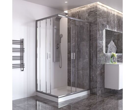 Форма: прямоугольник. Количество секций двери: 2. Конструкция дверей: раздвижные. Верхние ролики: двойные. Нижние ролики: двойные с кнопкой. Ширина входа, см: 58. Цвет профиля: хром. Материал профиля: алюминий. Материал стенок и дверей: закаленное стекло. Толщина стекла, мм: 6. Декор стекол: прозрачное. Тип монтажа: на пол или поддон.